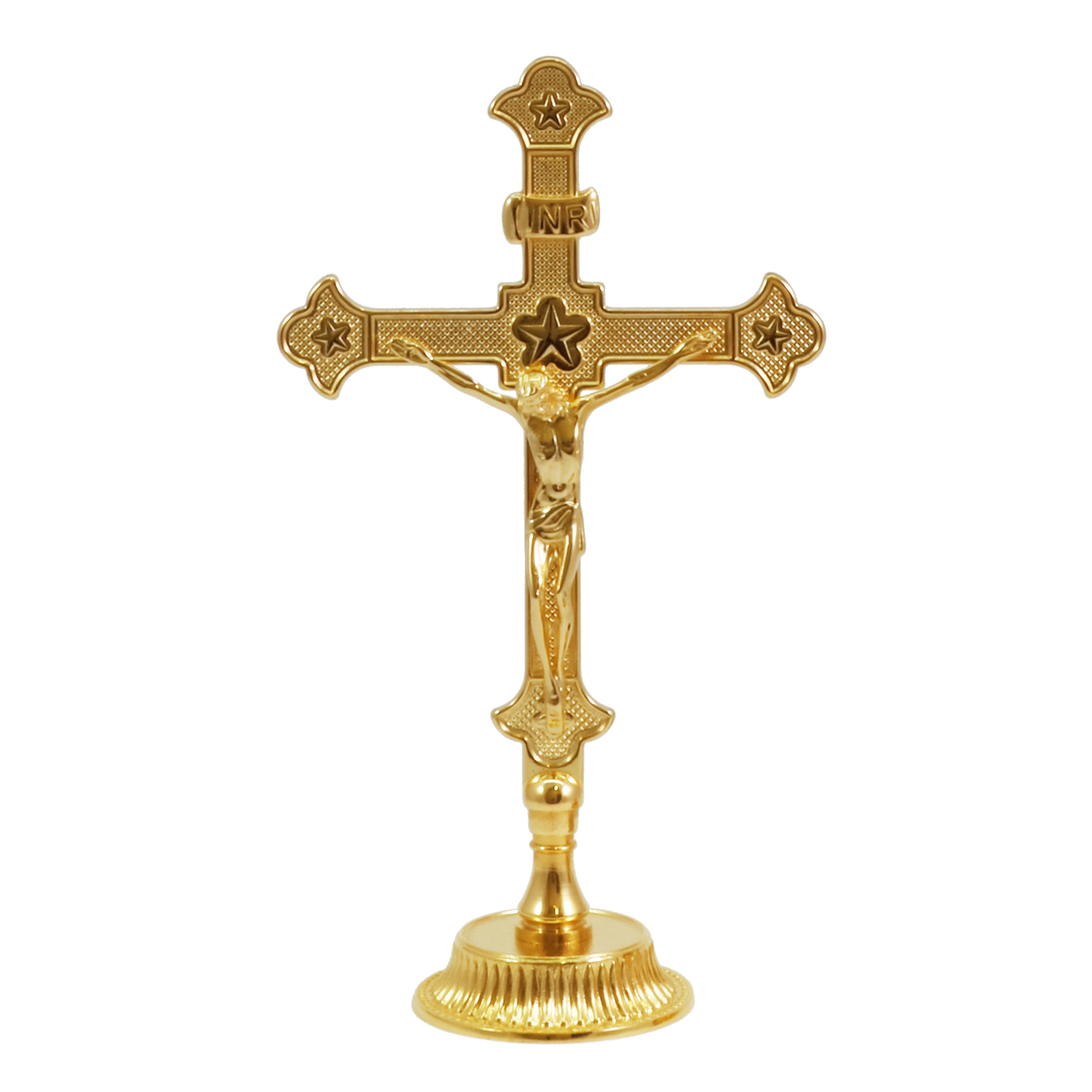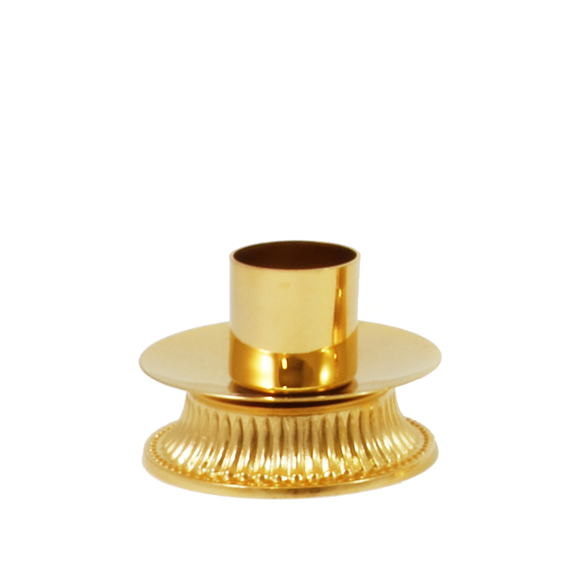 Altar cross and candlesticks in gold plated brass on a cast base decorated with grooves. The cross is 27 cm high and the candlestick is 6 cm high with a 4 cm diameter liquid wax candle case It is possible to purchase the cross, the candlestick, or the complete set of the cross and two candlesticks.