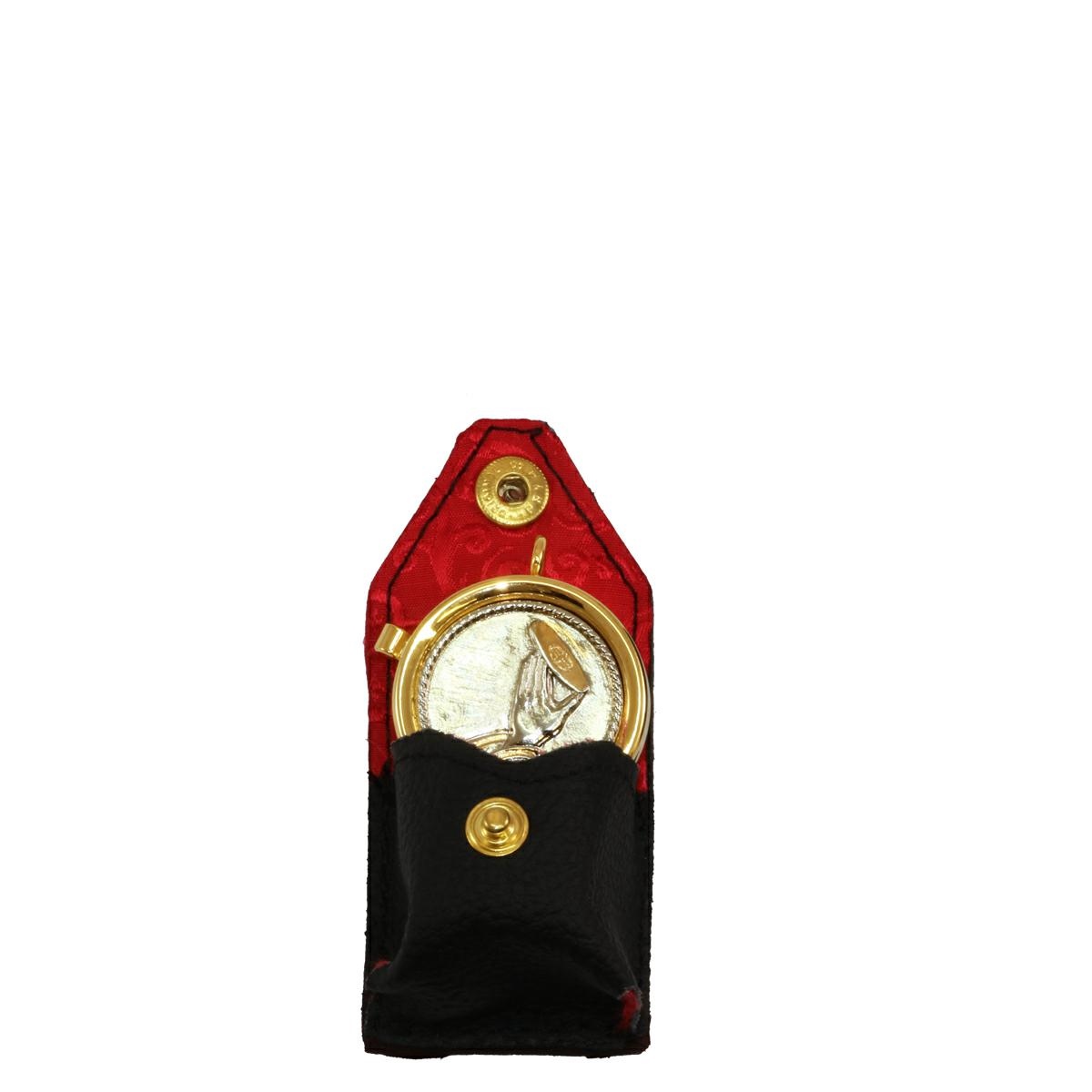 Porta teca in Vera Pelle nera, completo di techina eucaristica di diametro 4 cm. in ottone dorato con placchetta decorativa argentata.