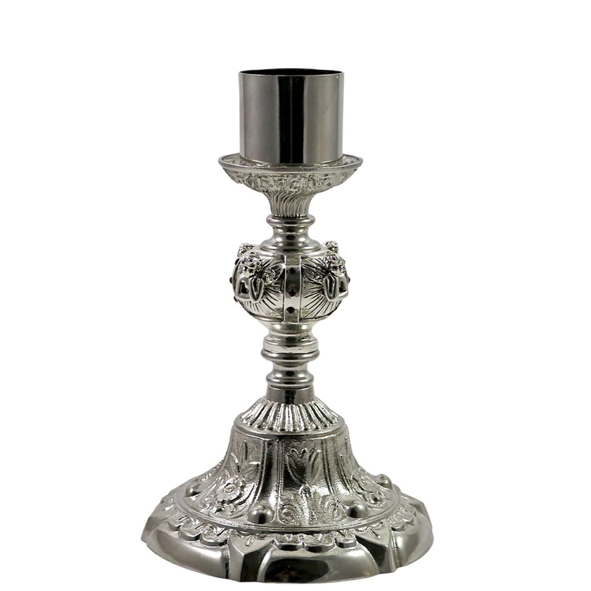 Set composto da Croce doppia e 2 Candelieri da altare in ottone tono argento con elegante nodo decorato con Angeli e pietre rosse su base in fusione con decori barocchi.