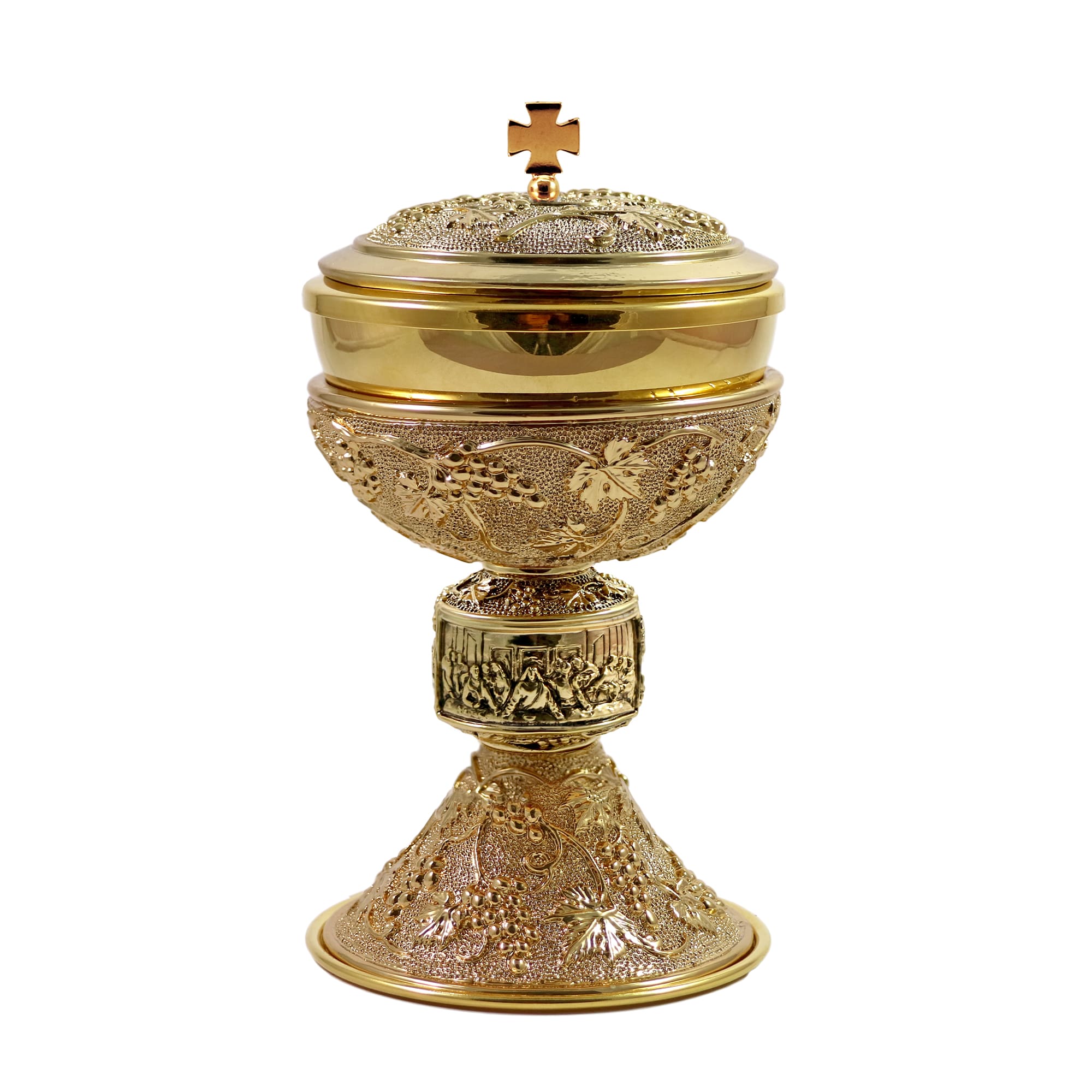 Calice e Pisside in ottone dorato con sottocoppa e base decorate con Uva e foglie di Vite in rilievo in finitura oro brunito. Nel nodo � raffigurata l'immagine dell' Ultima Cena di Leonardo .