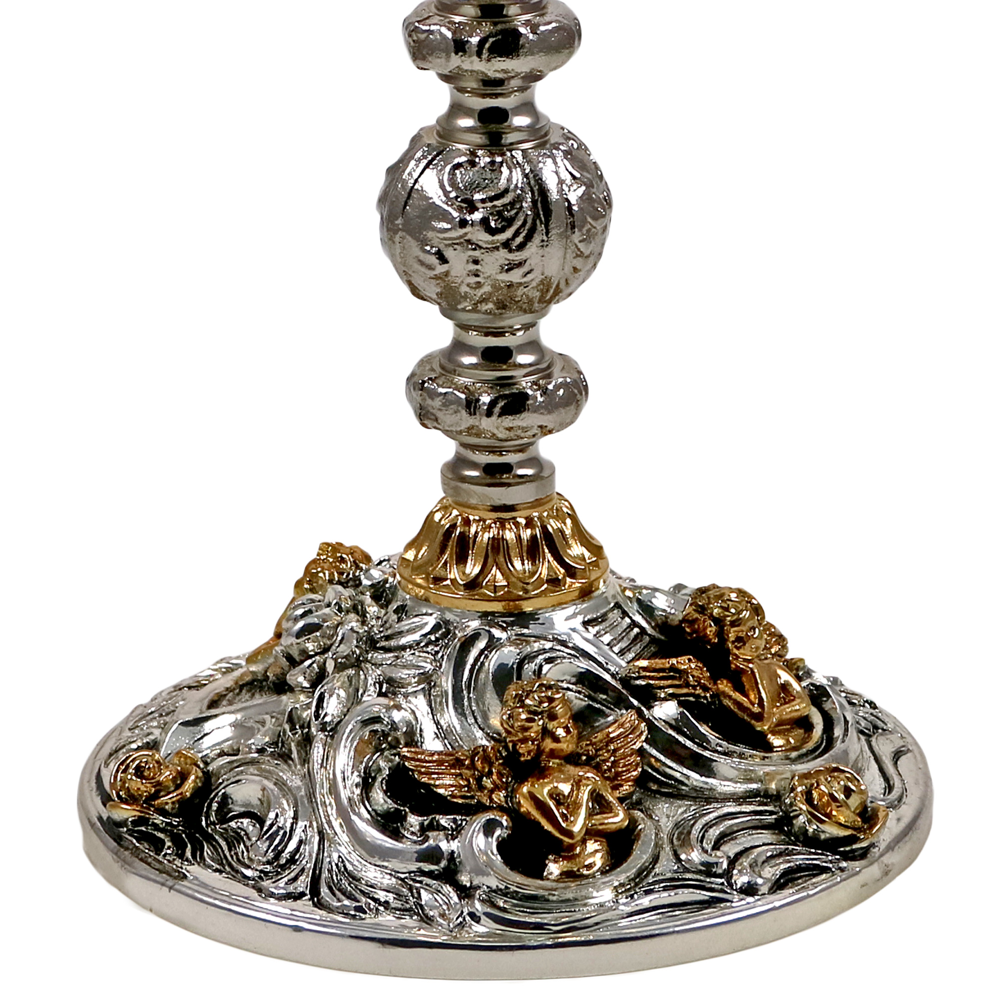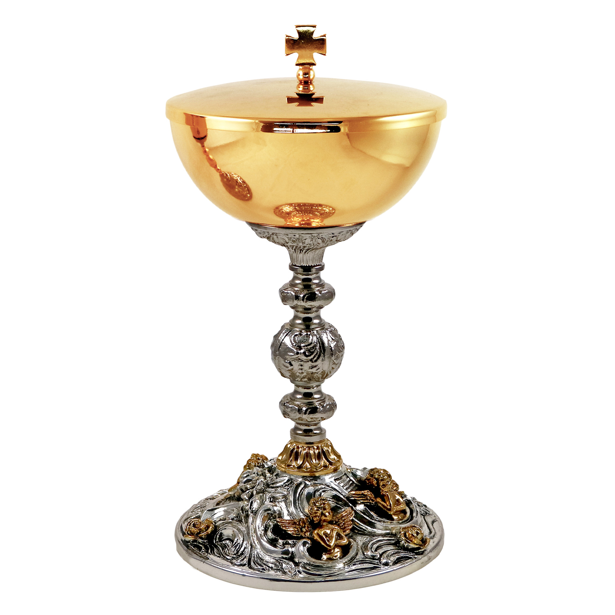 Chalice and Ciborium in gold plated brass with a baroque base in an antique silver finish decorated with golden angels. The Chalice is 24 cm tall and has a 10 cm diameter cup that can hold up to 350 ml of wine. The Ciborium is 21 cm tall and has a 12 cm diameter cup that can hold up to 150 hosts.