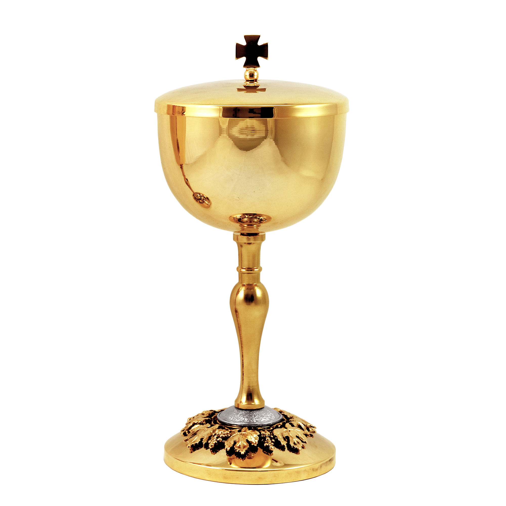 Chalice and Ciborium in gold plated brass with grape and vine leaf decoration on the base, in an antique brass finish. The Chalice is 20.5 cm tall and has an 8.5 cm diameter cup that can hold up to 200 ml of wine. The Ciborium is 19 cm tall and has a 10 cm diameter cup that can hold up to 100 hosts.