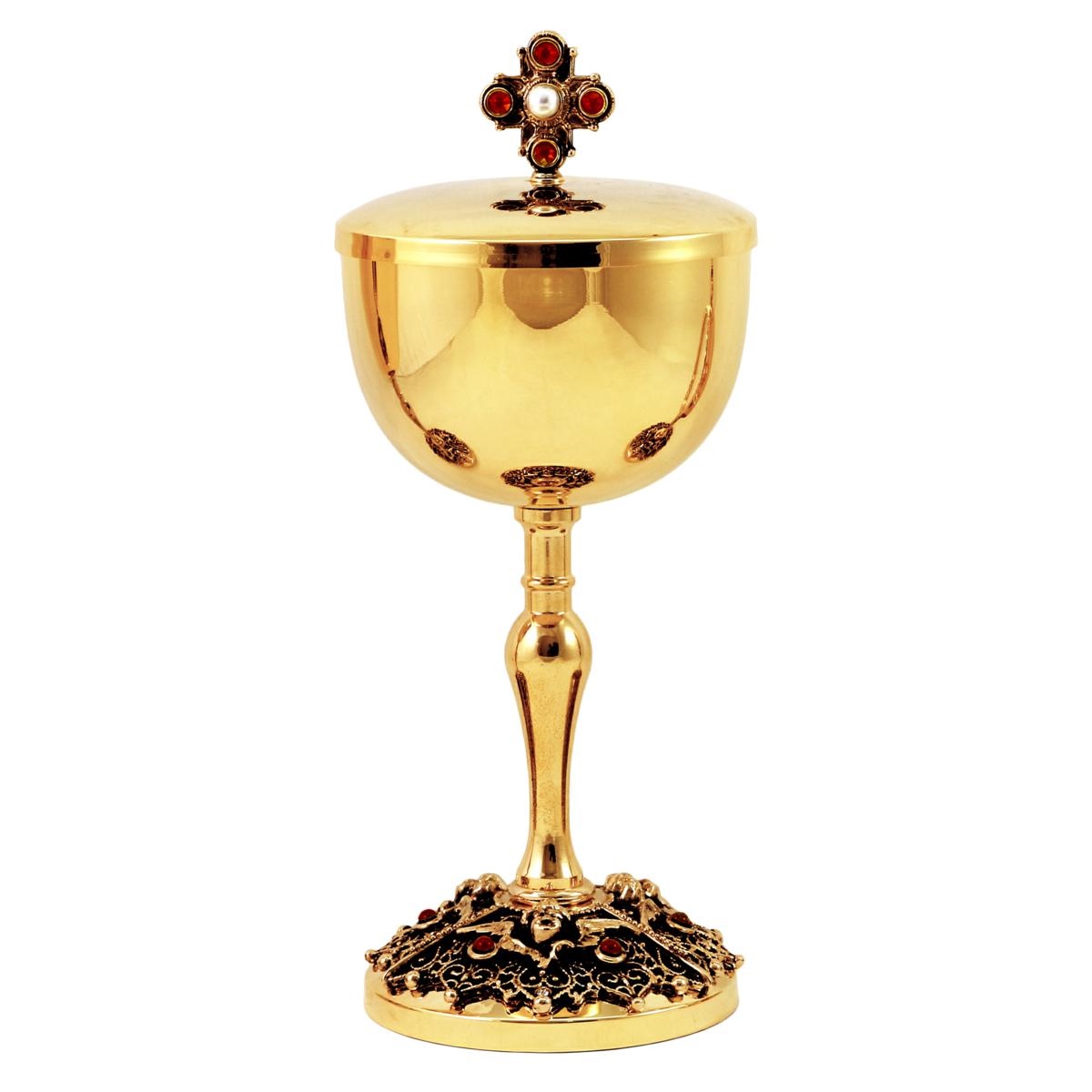 Chalice and Ciborium in gold plated brass with an elegant "Angels and red stones" base in an antique brass finish. The Chalice is 20.5 cm tall and has an 8.5 cm diameter cup that can hold up to 200 ml of wine. The Ciborium is 19.5 cm tall and has a 10 cm diameter cup that can hold up to 100 hosts. A cross with red stones and imitation pearls is applied to the lid of the Ciborium.