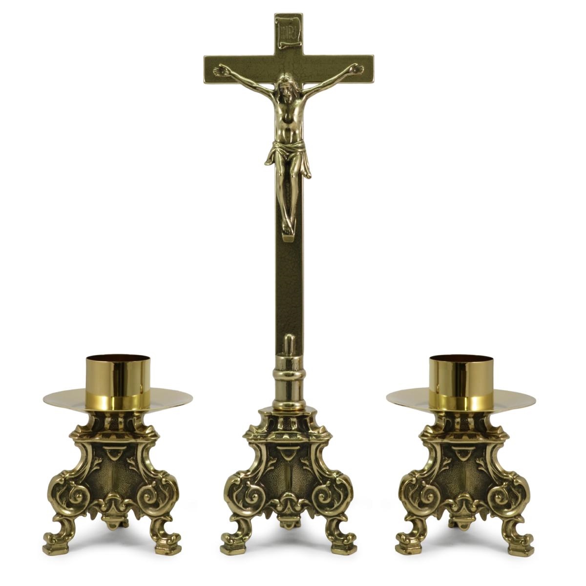Croce e candelieri da altare in ottone brunito su base Rococò.