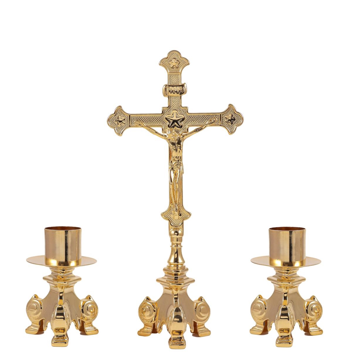 Croce e candelieri da altare in ottone lucido su base barocca.