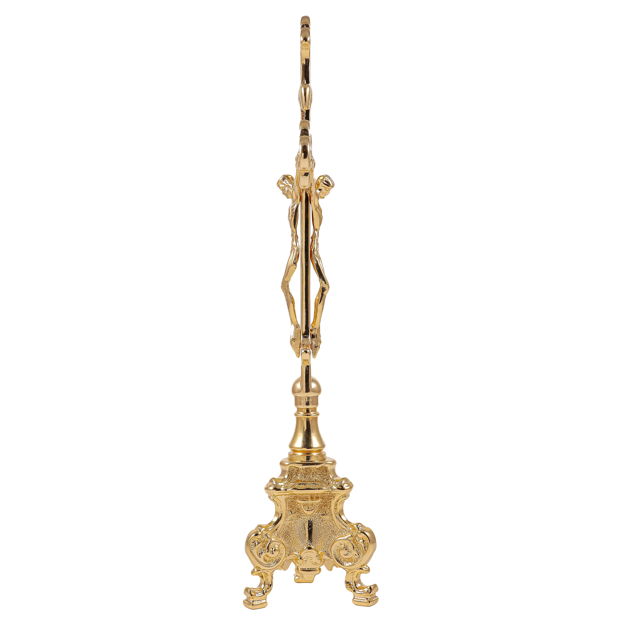 Altar cross and candlesticks in gold plated brass on a Rococo base. The cross has a double body and is 33 cm high. The candlestick is 11.5 cm high, with a 4 cm diameter liquid wax candle case It is possible to purchase the cross, the candlestick, or the complete set of the cross and two candlesticks.
