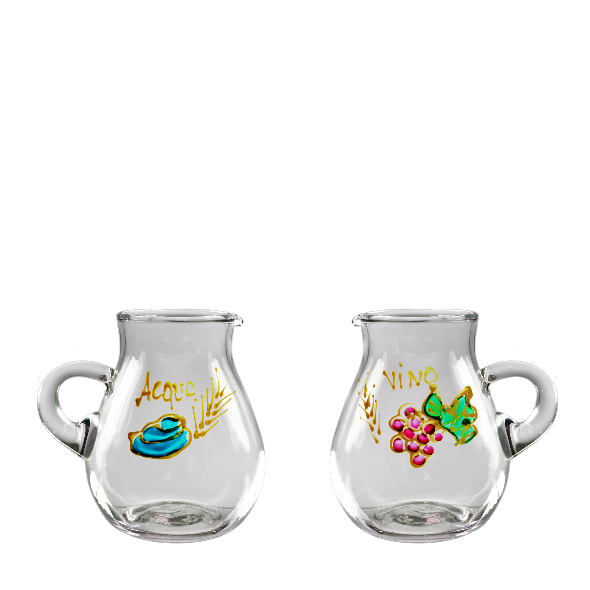 Water and Wine set with glass plate and "Bologna" model glass jugs with hand-painted Water and Wine decoration.