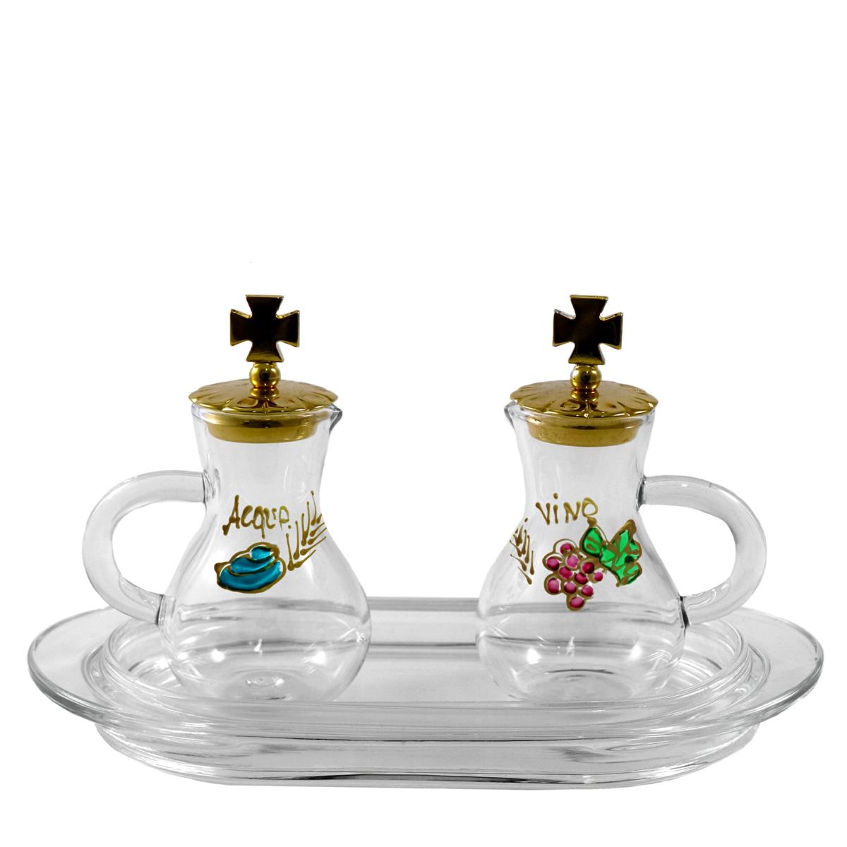 Servizio per Acqua e Vino con piatto in vetro dotato di brocchette in vetro modello "Parma" con decoro Acqua e Vino dipinto a mano.