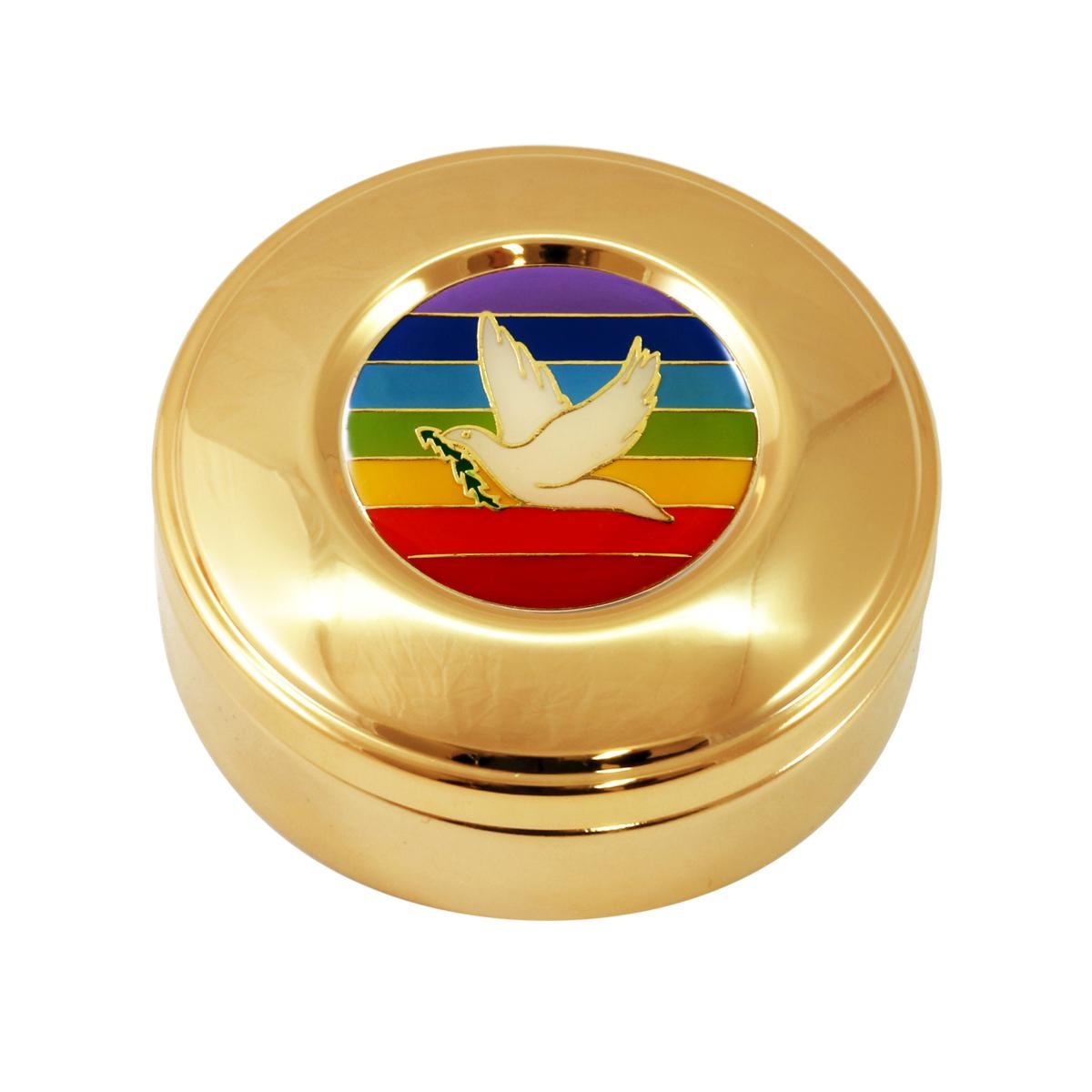 Scatola porta ostie in ottone dorato con placca decorativa raffigurante una colomba con i colori della pace.