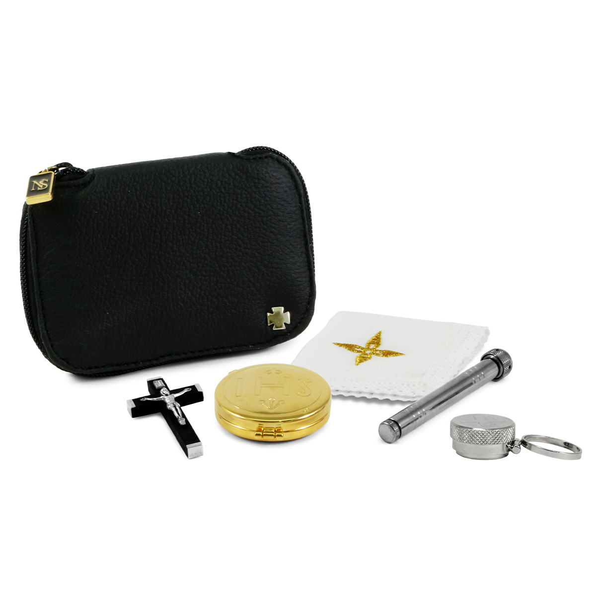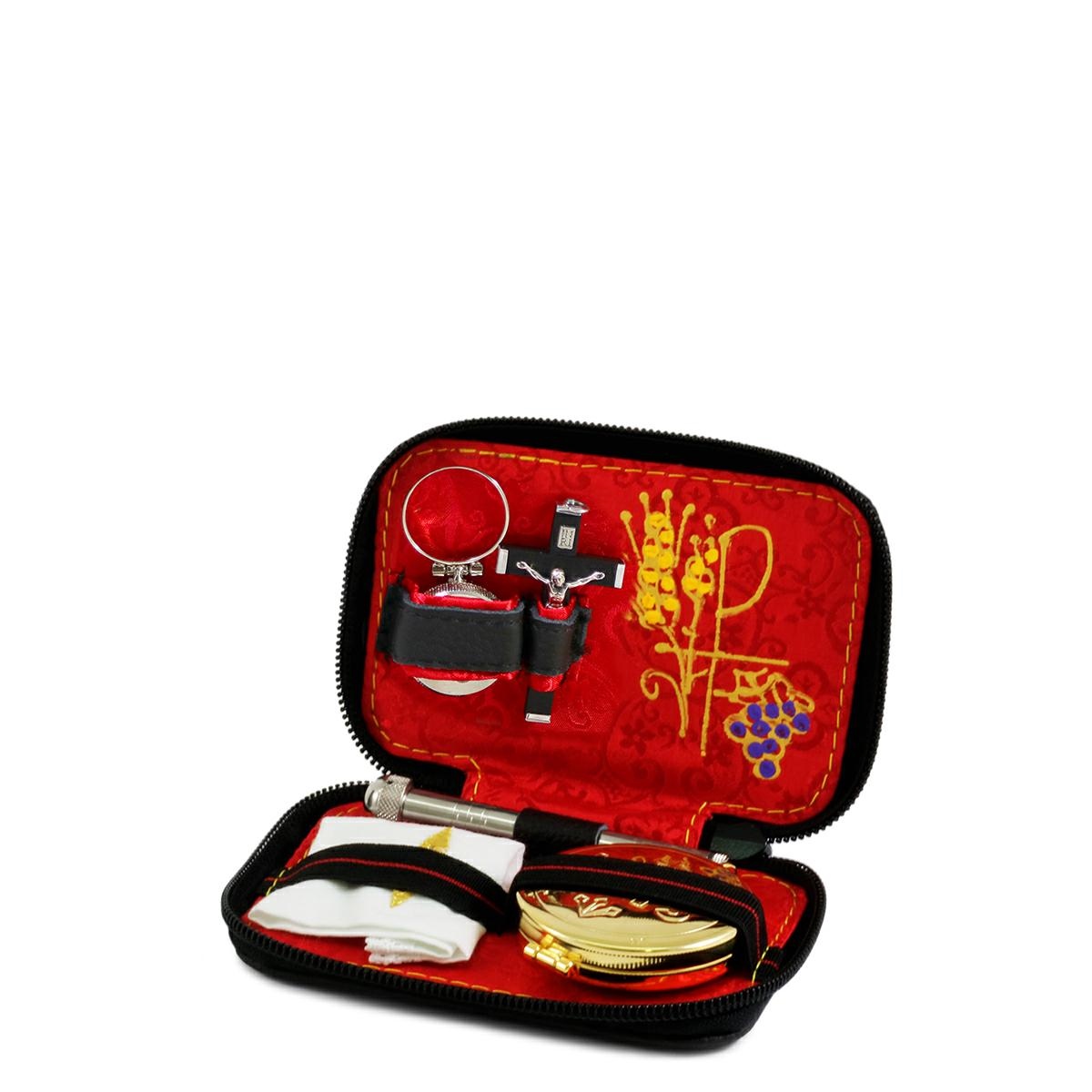 Pocket viaticum case in genuine black leather, internally lined in red satin. On the front there is a silver cross. The item is complete with: - Eucharistic pyx in gold-plated brass with IHS engraving. The pyx has a diameter of 5.3 cm. and contains approximately 12 hosts. - Wooden cross. - Holy Oil stock in silver-tone brass with ring and cross engraved on the cap. - 100% cotton linen 10x10 cm. with cross embroidered in gold thread.