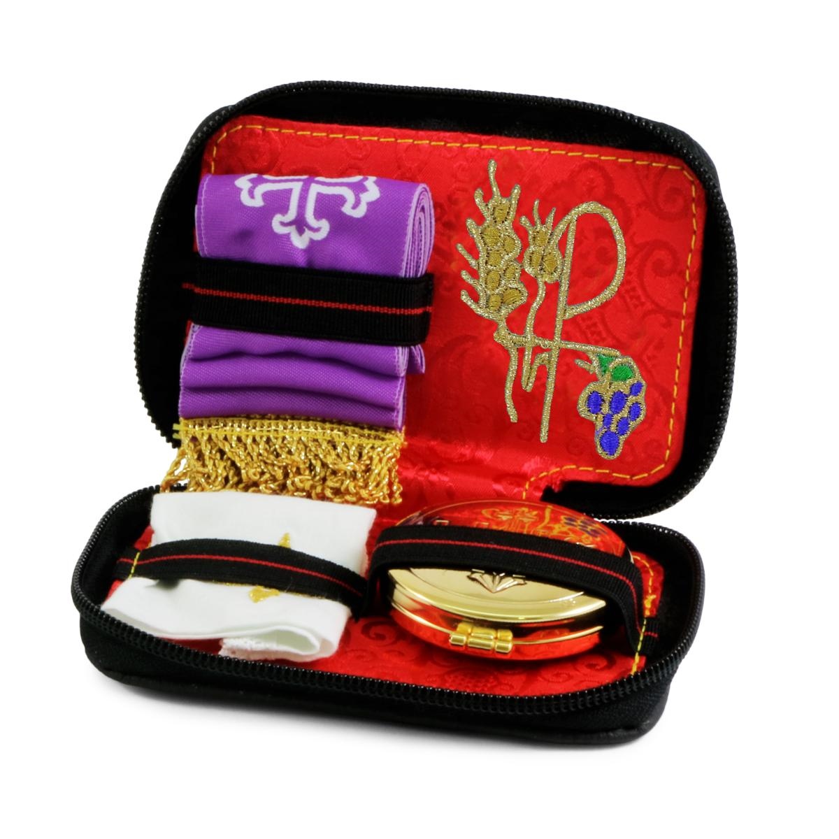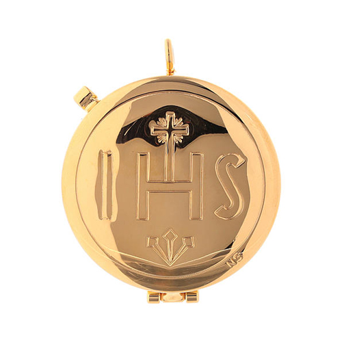 -Teca Eucaristica in ottone dorato con incisione IHS. La teca ha un diametro di 5,3 cm. e contiene circa 12 particole.