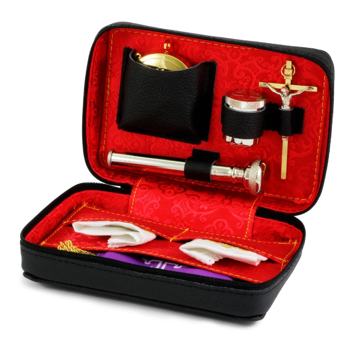 Genuine black leather viaticum case, internally lined in red satin. Complete with: - Eucharistic pyx in gold-plated brass with IHS engraving. The pyx has a diameter of 5.3 cm and contains approximately 12 hosts. - Silver-tone brass asperges 11.5 cm with hermetic seal. - Silver-tone brass Holy Oils stock. - gold plated brass cross. - Two-tone purple and white stole 150 cm. - 2 pcs 100% cotton linen 10x10 and 15x15 cm.100% cotton with gold-thread embroidered cross.