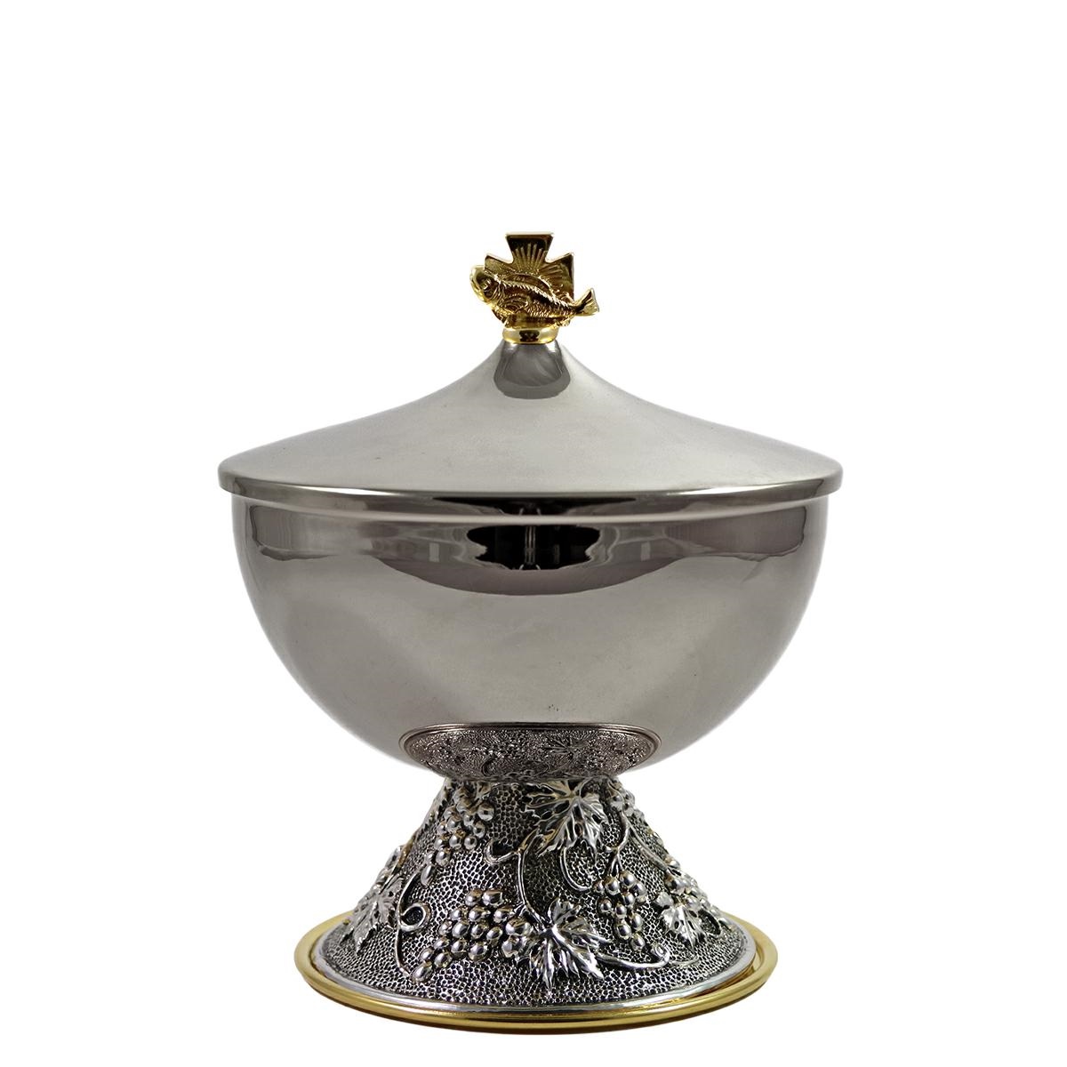 Pisside sotto le 2 specie in ottone tono argento, dorata internamente, su elegante base decorata con "Uva e foglie di Vite" in rilievo, in finitura argento antico.