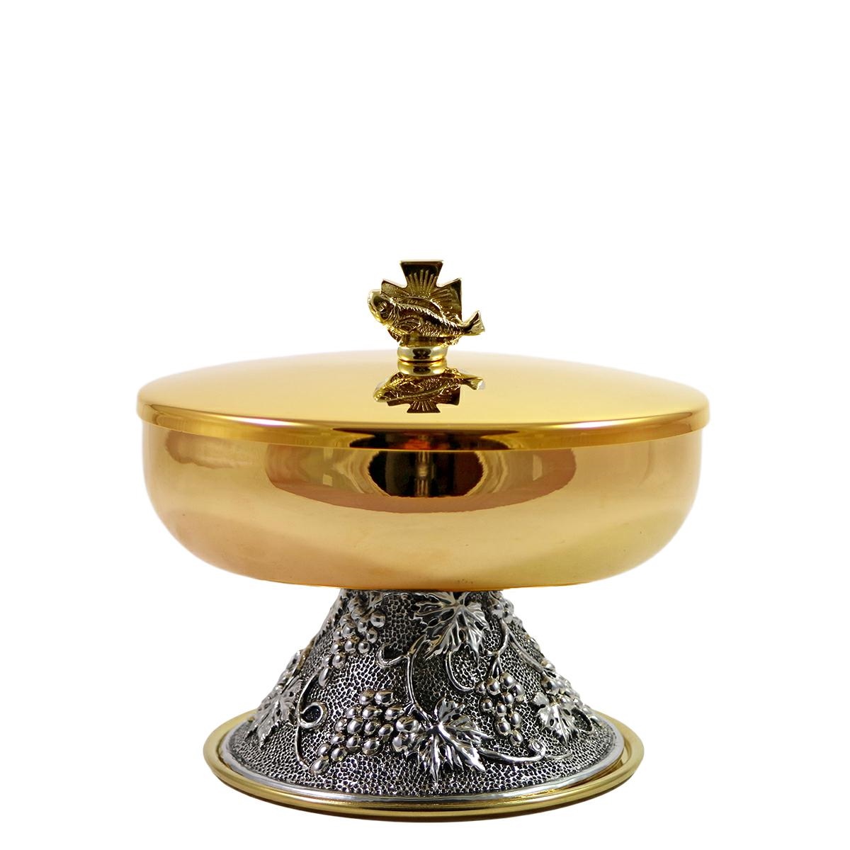Ciborium bowl in gold plated brass on a base with a "Fish and Px" relief, in an antique silver finish. The Ciborium bowl has a diameter of 14 cm and contains approximately 100 particles. On the lid of the pyx is a cross decorated with the symbol of the fish. Size: Ø 14 cm. Capacity: approximately 100 particles