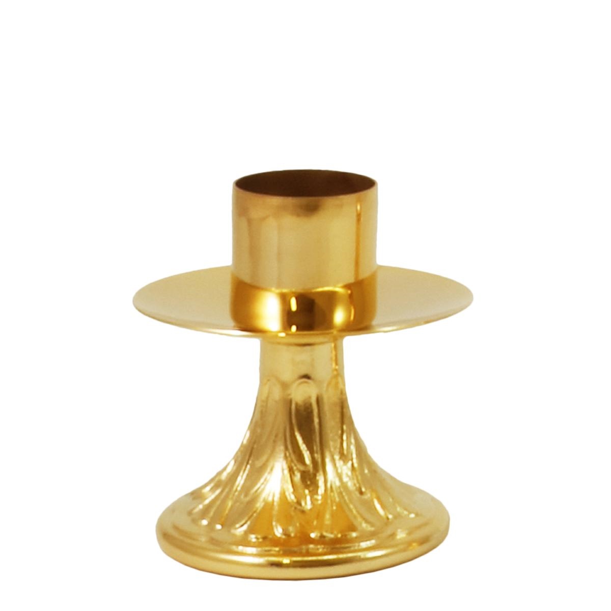 Altar cross and candlesticks in gold plated brass on a cast base with decorations. The cross is 29.5 cm high and the candlestick is 8.5 cm high with a 4 cm diameter liquid wax candle case It is possible to purchase the cross, the candlestick, or the complete set of the cross and two candlesticks.