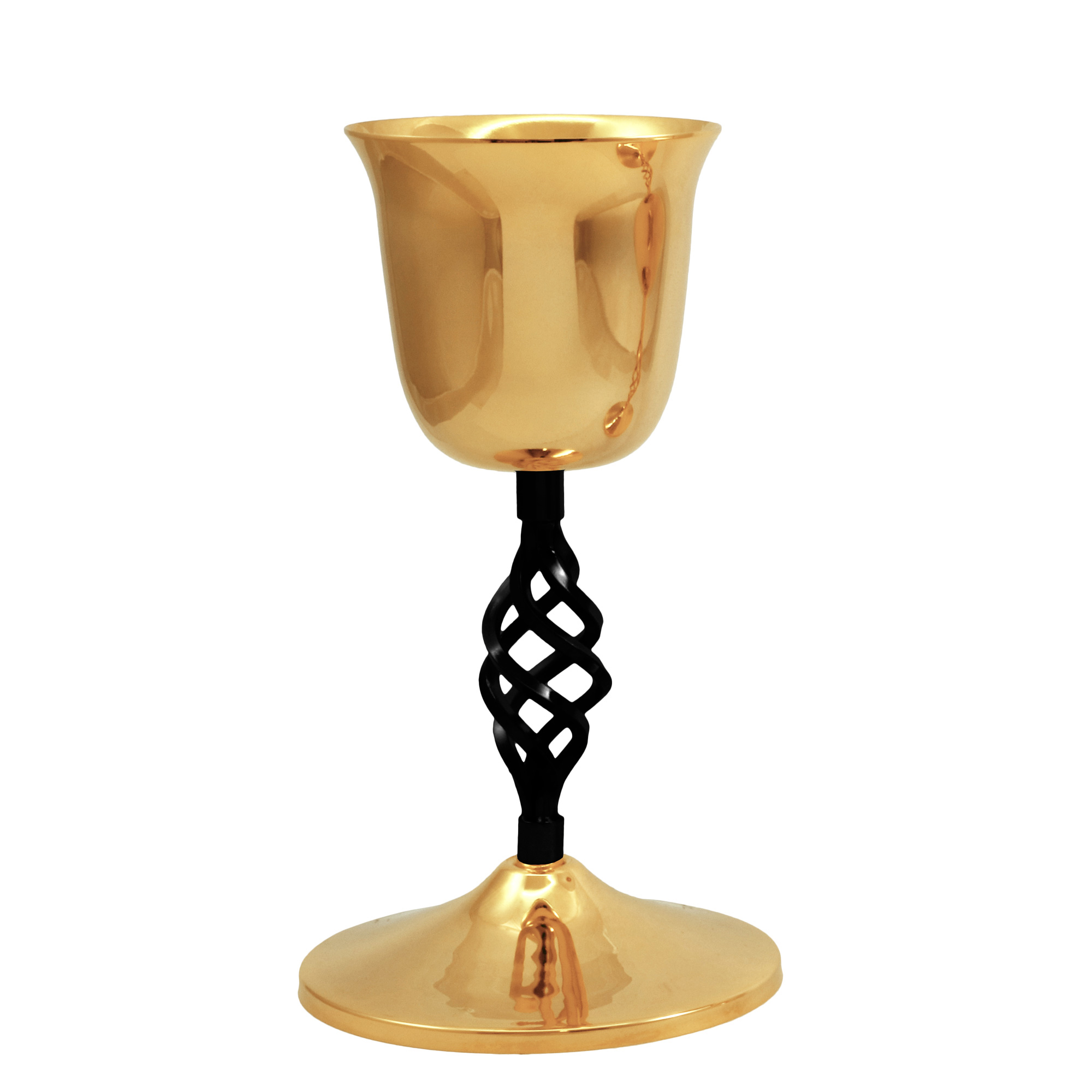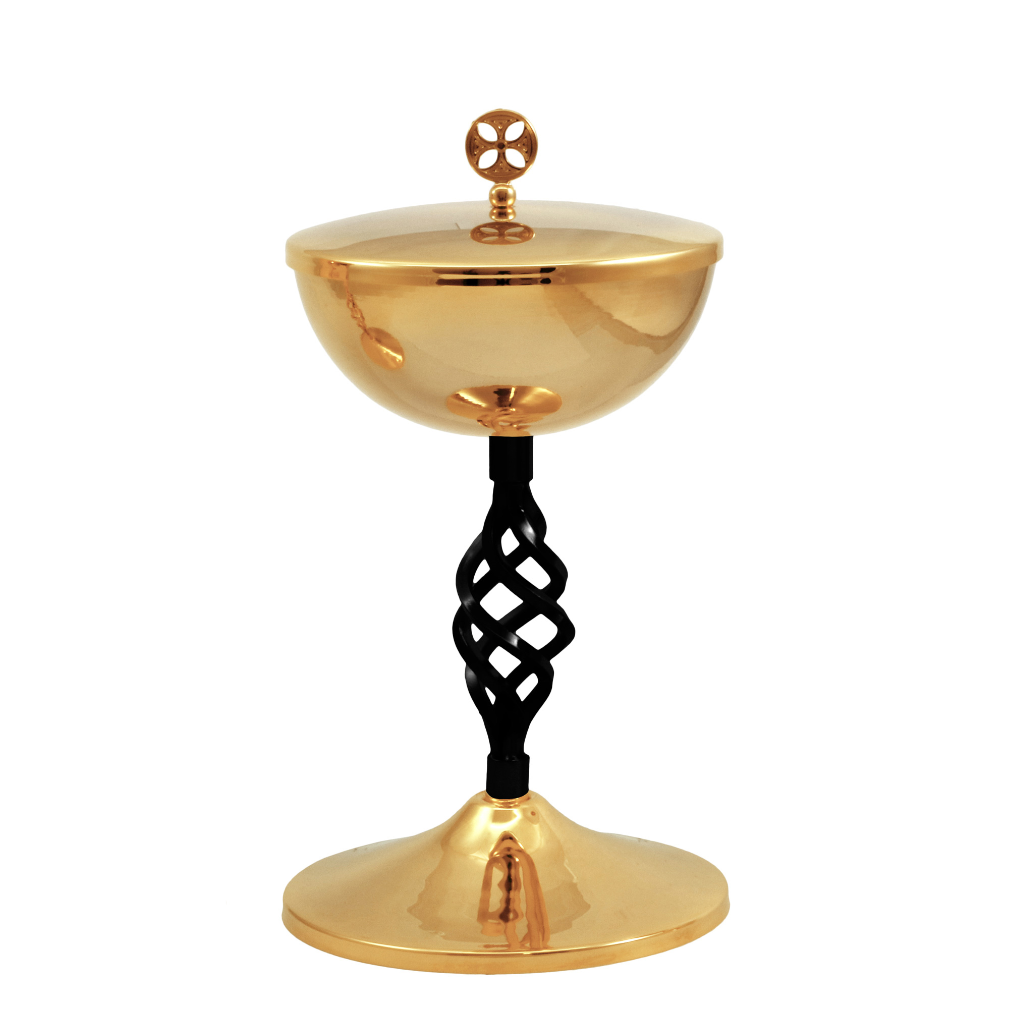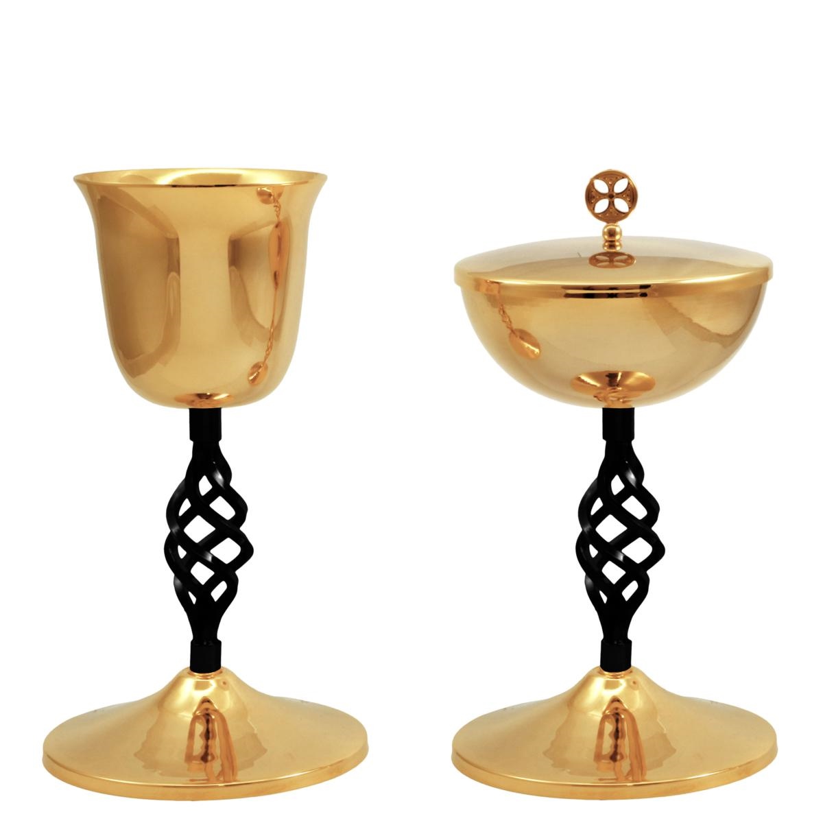 Calice e Pisside in ottone dorato con particolare nodo ellittico color grafite.