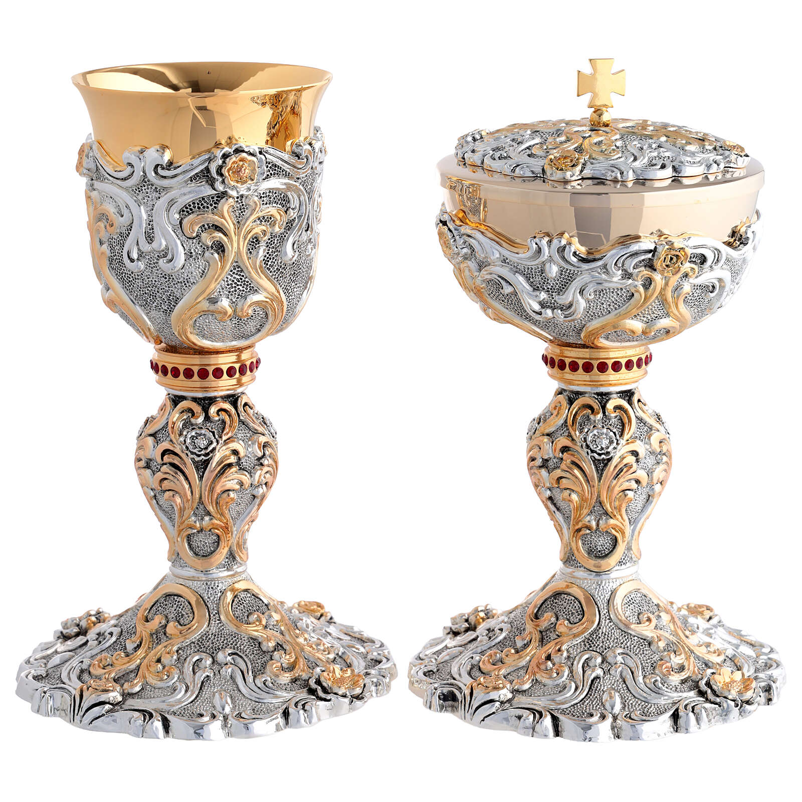 Chalice and Ciborium with two-tone elegant floral swirls and raised roses, crafted with a refined blend of 24K gold-plated and silver finishes. The knot is adorned with a series of ruby red crystals, adding a touch of solemnity and beauty.