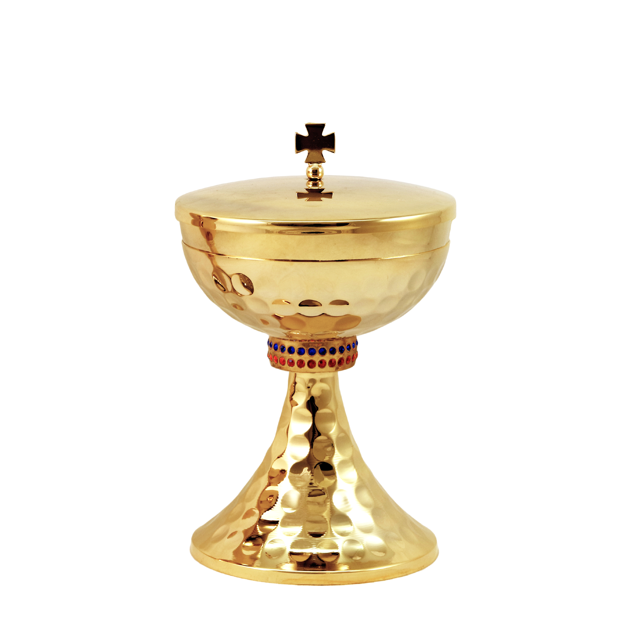 Chalice and Ciborium in gold plated brass with a hammered gold base and saucer and a knot decorated with red and blue stones. The Chalice is 18 cm tall and has a 10 cm diameter cup that can hold up to 350 ml of wine. The Ciborium is 16 cm tall and has a 12 cm diameter cup that can hold up to 150 hosts.