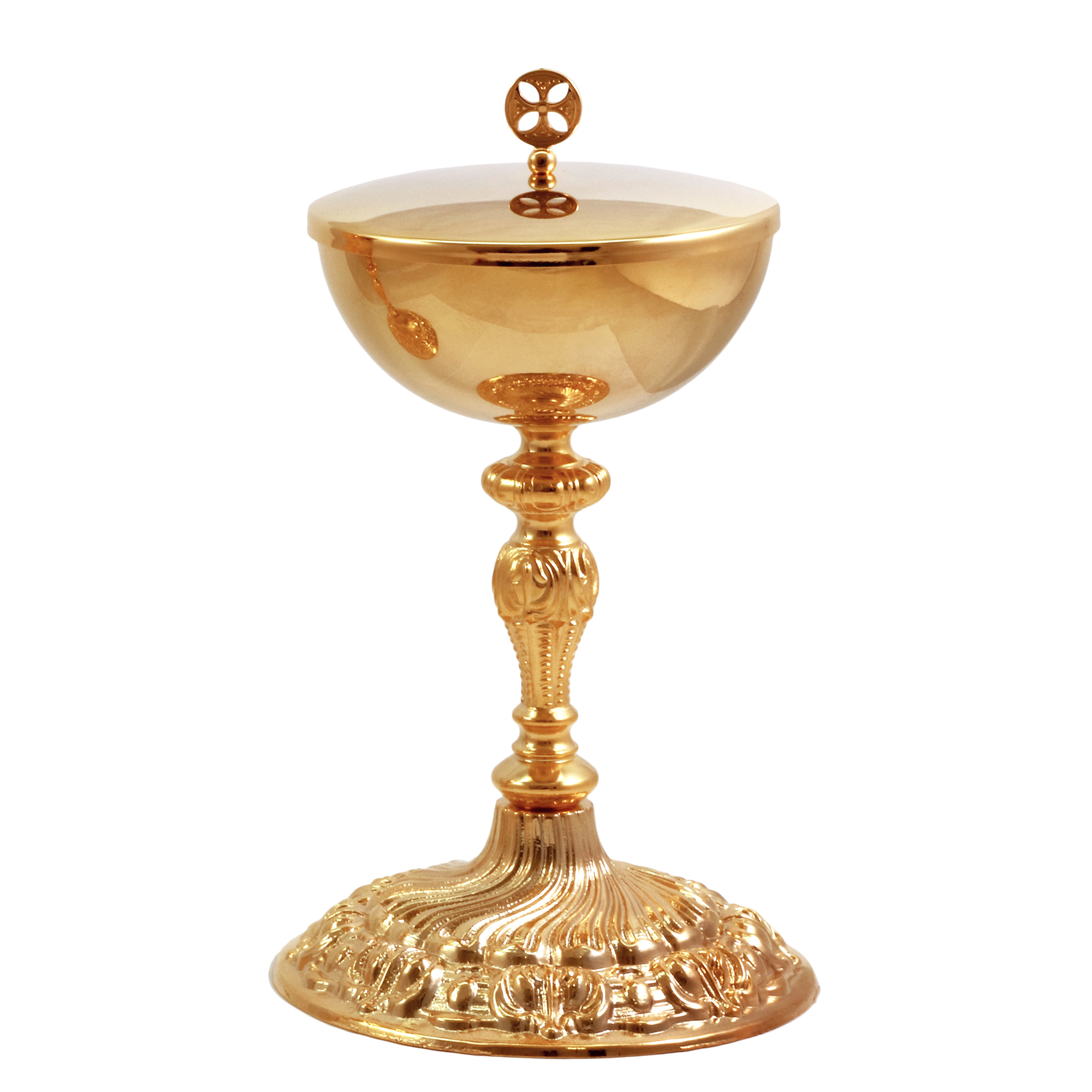 Chalice and Ciborium in gold plated brass with a unique shell-style base. The chalice is 21 cm tall and has a 9.5 cm diameter cup that can hold up to 300 ml of wine. The Ciborium is 17.5 cm tall and has a 12 cm diameter cup that can hold up to 150 hosts.