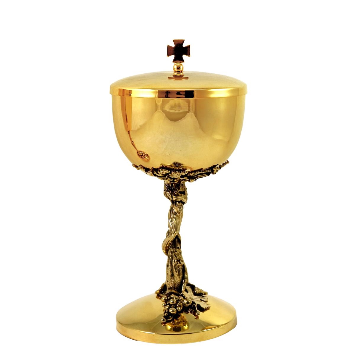 Calice e Pisside in ottone dorato con sottocoppa e nodo raffiguranti foglie d' uva e tralci di vite in finitura oro brunito.