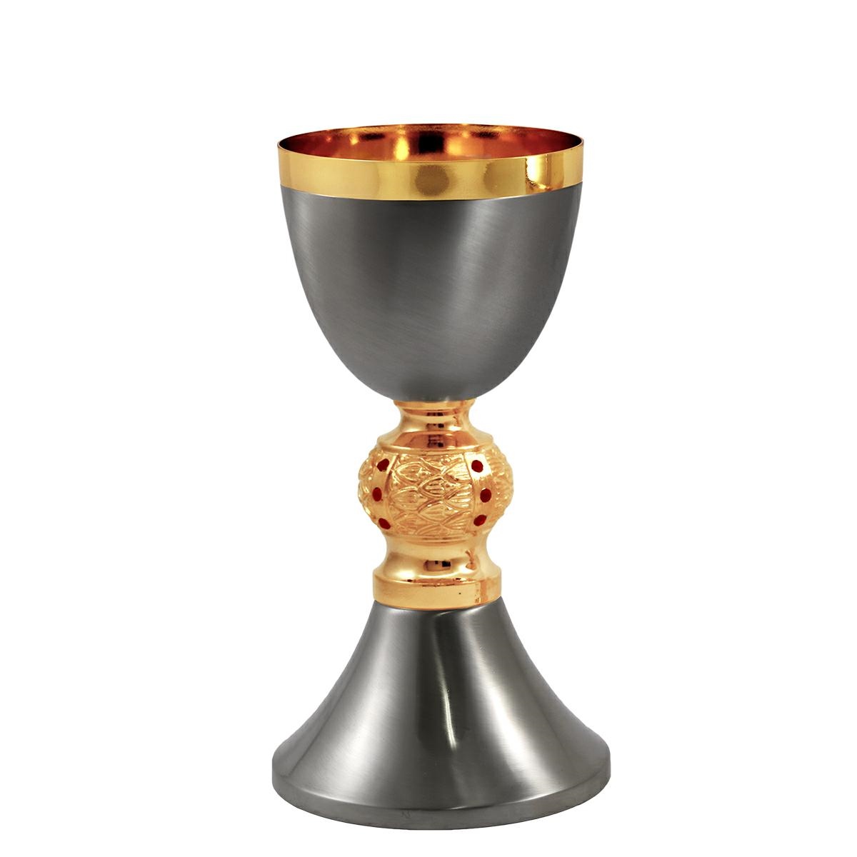 Chalice and Ciborium in gold plated brass with a satin-finish silver-tone base and saucer for a unique matte effect. The Baroque-style knot is gold-finished and adorned with red stones. The Chalice is 21 cm tall and has a 10 cm diameter cup that can hold up to 350 ml of wine. The Ciborium is 19 cm tall and has a 12 cm diameter cup that can hold up to 150 hosts.
