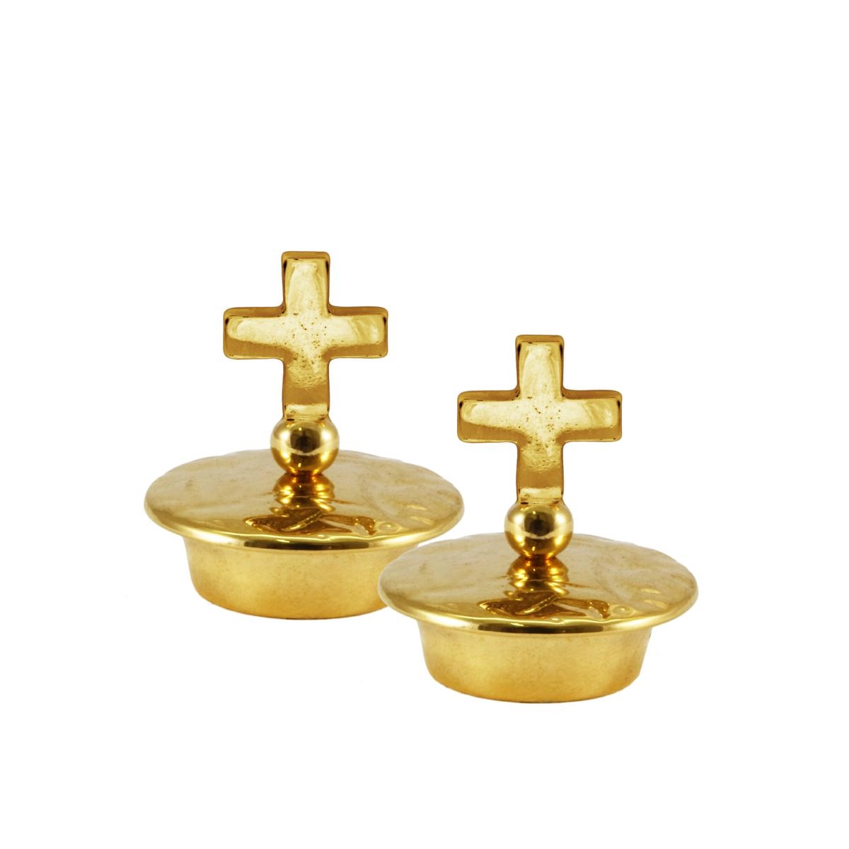 Coppia tappi dorati per brocchette in vetro, con Croce classica.