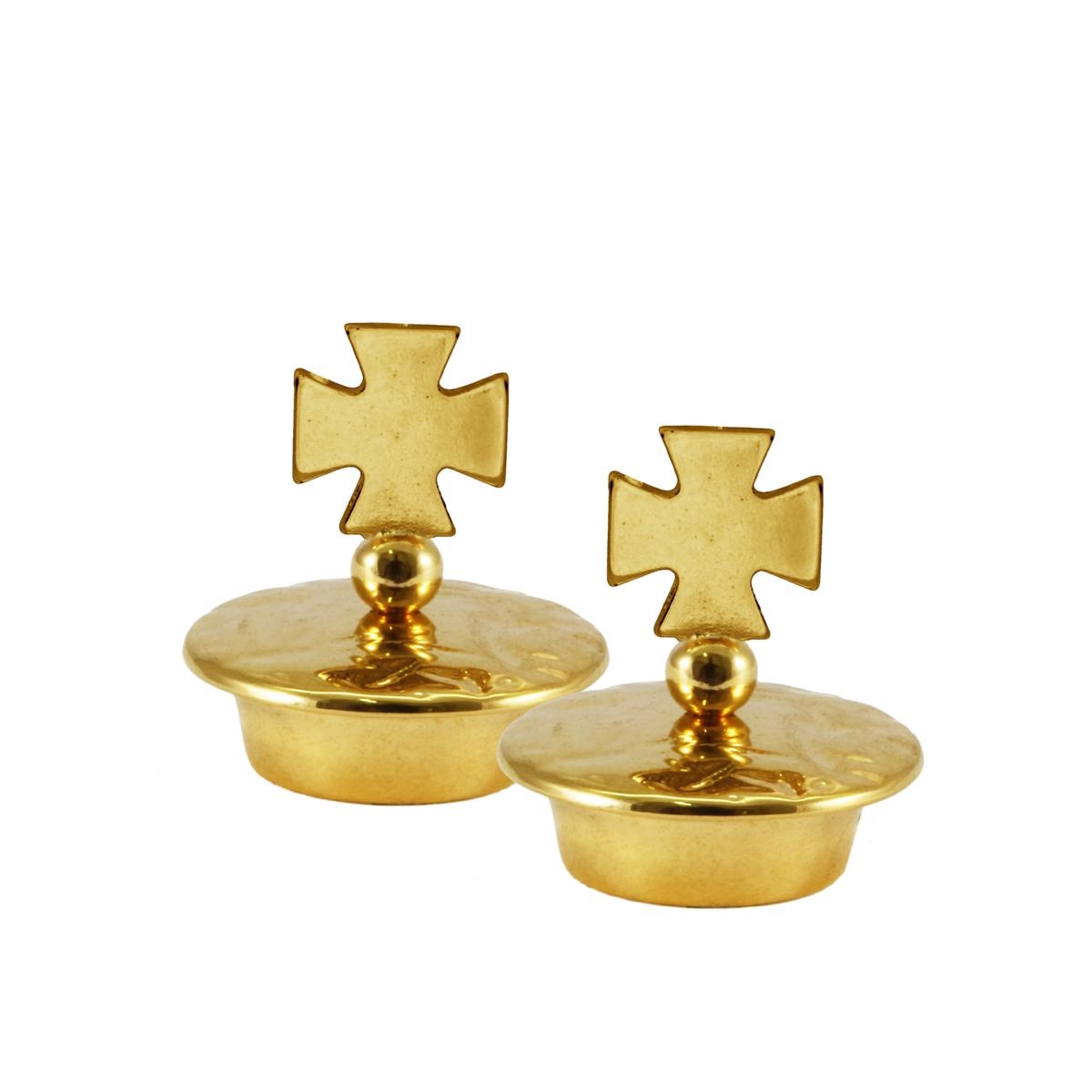 Coppia tappi dorati per brocchette in vetro, con Croce classica.
