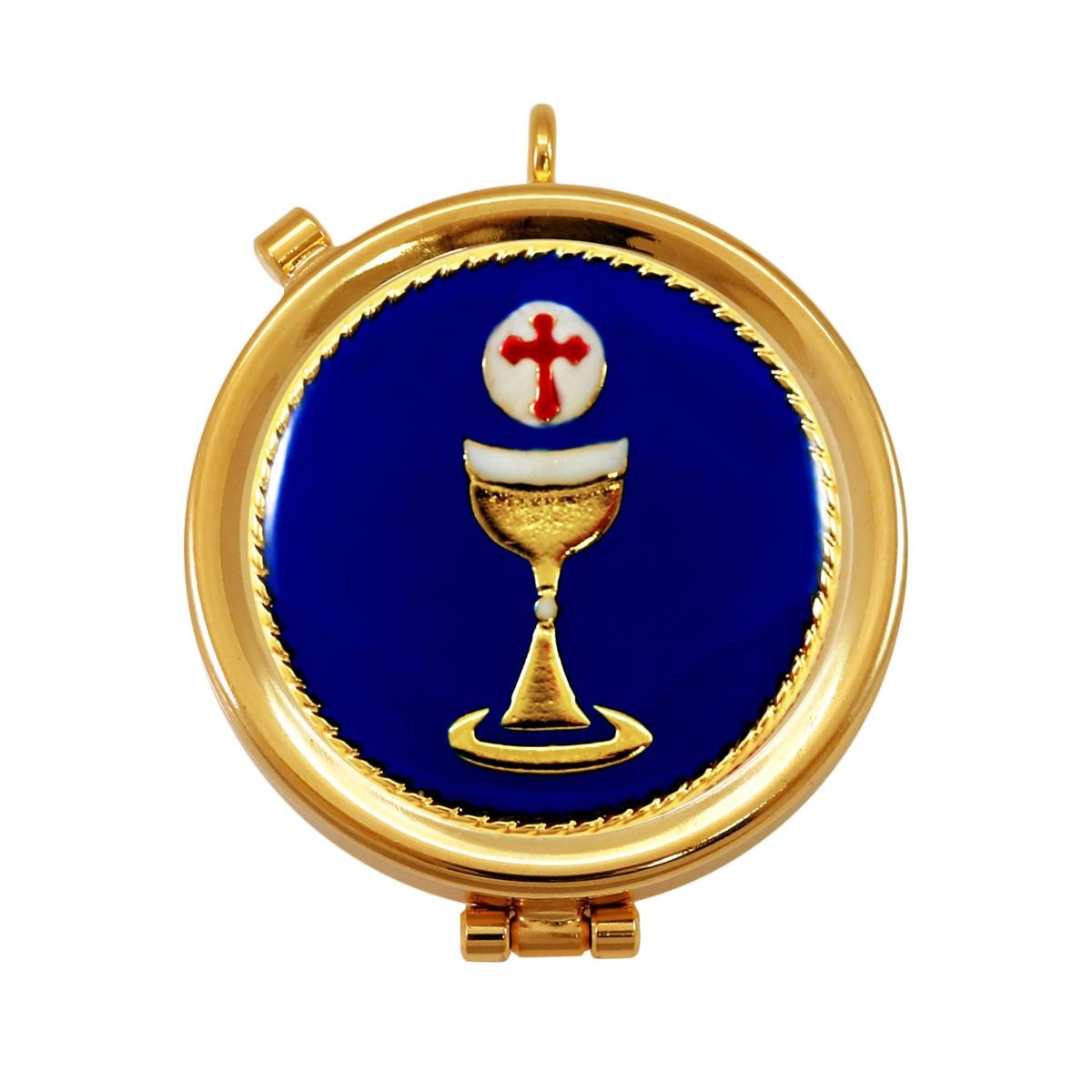 Teca Eucaristica in ottone dorato con placca decorativa smaltata a mano, raffigurante l'immagine del Calice su sfondo blu, con sopra una Croce.