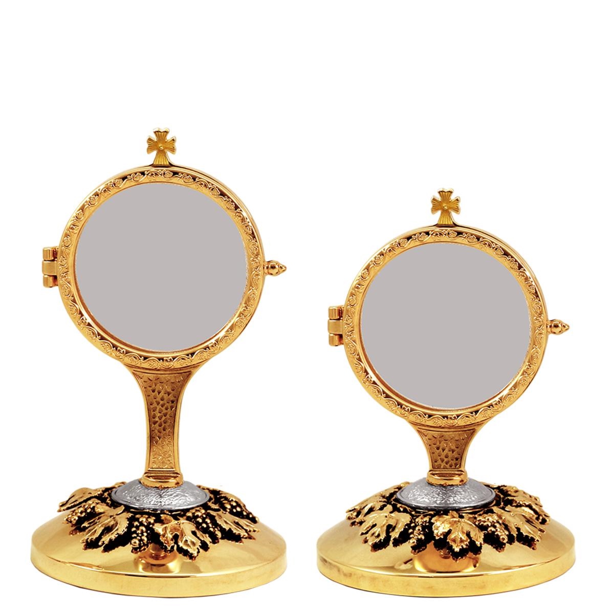 Teca per esposizione dell' Ostia magna in fusione dorata su base decorata con Uva e foglie di Vite in finitura ottone anticato. La base è in finitura dorata.