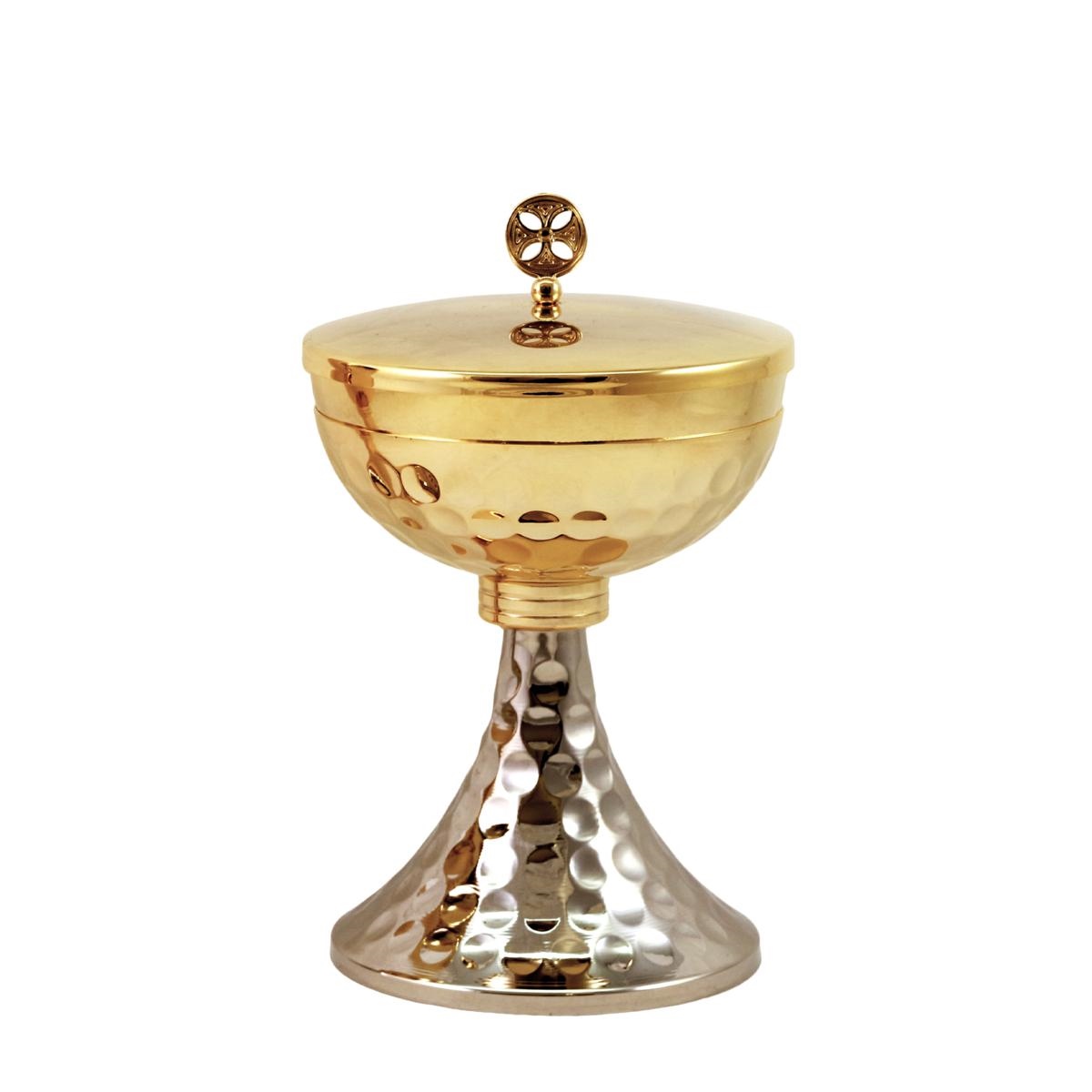 Chalice and Ciborium in gold plated brass with a hammered base in a silver-tone finish and a hammered gold saucer. The knot is cast in a gold finish. The chalice is 18 cm tall and has a 10 cm diameter cup that can hold up to 350 ml of wine. The Ciborium is 16 cm tall and has a 12 cm diameter cup that can hold up to 150 hosts.