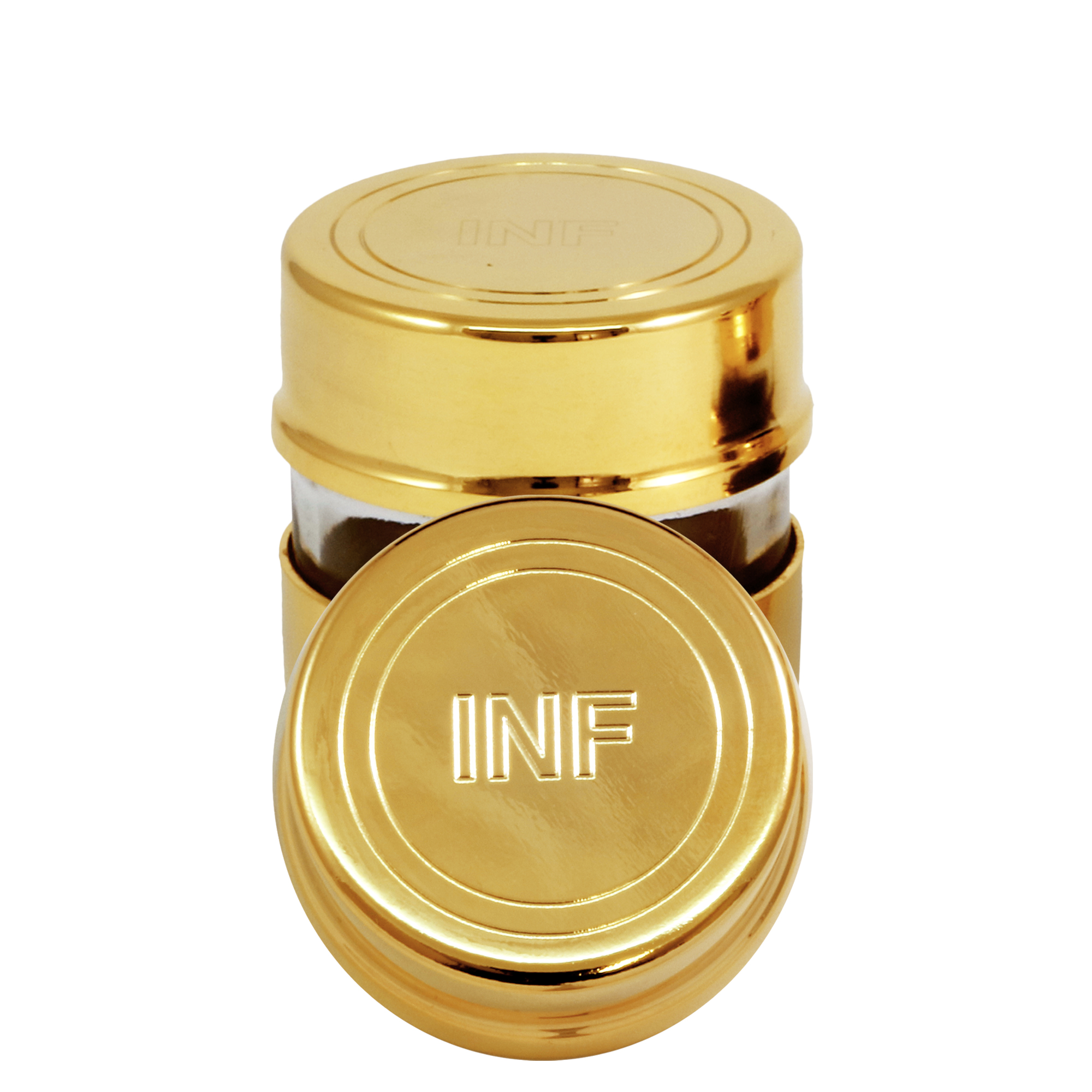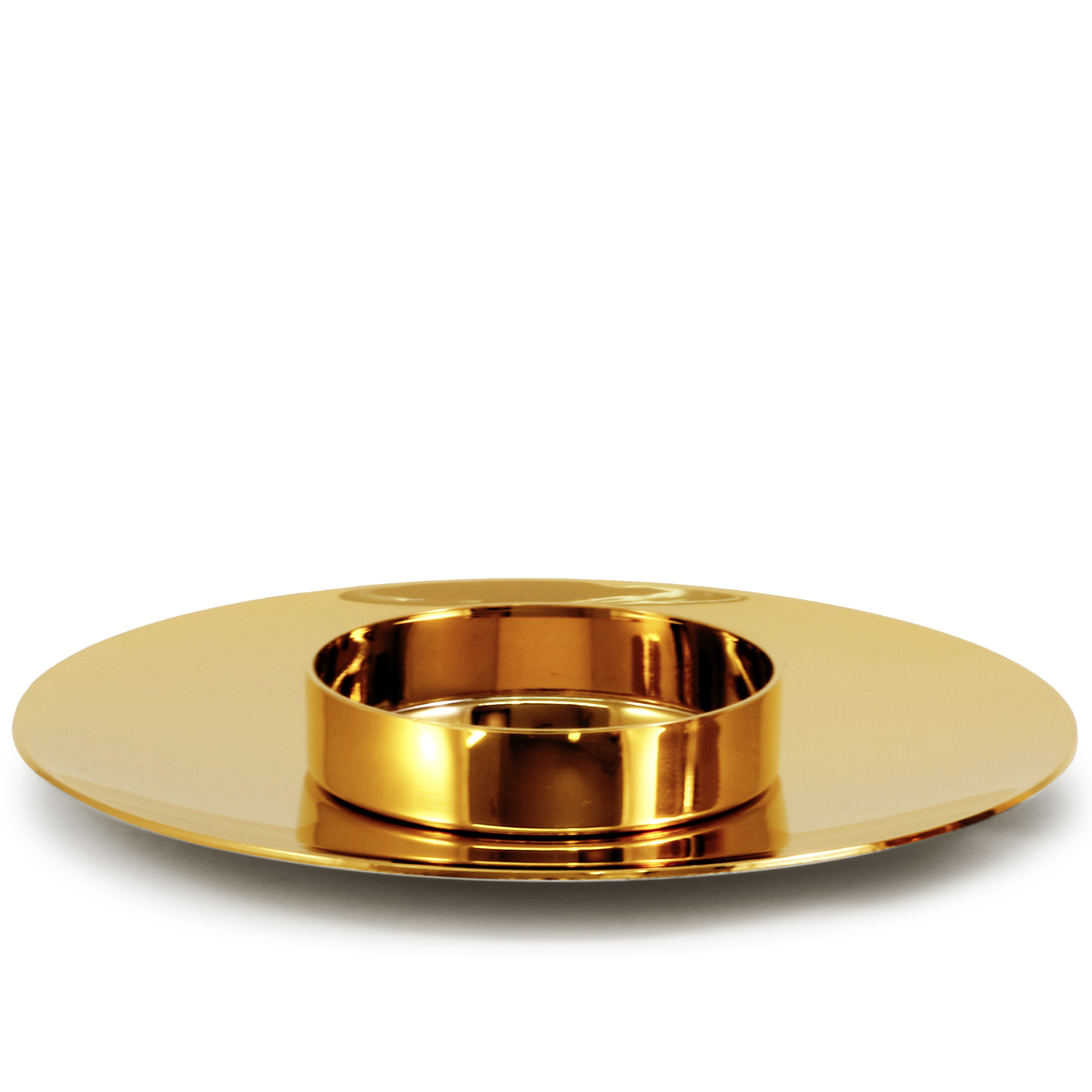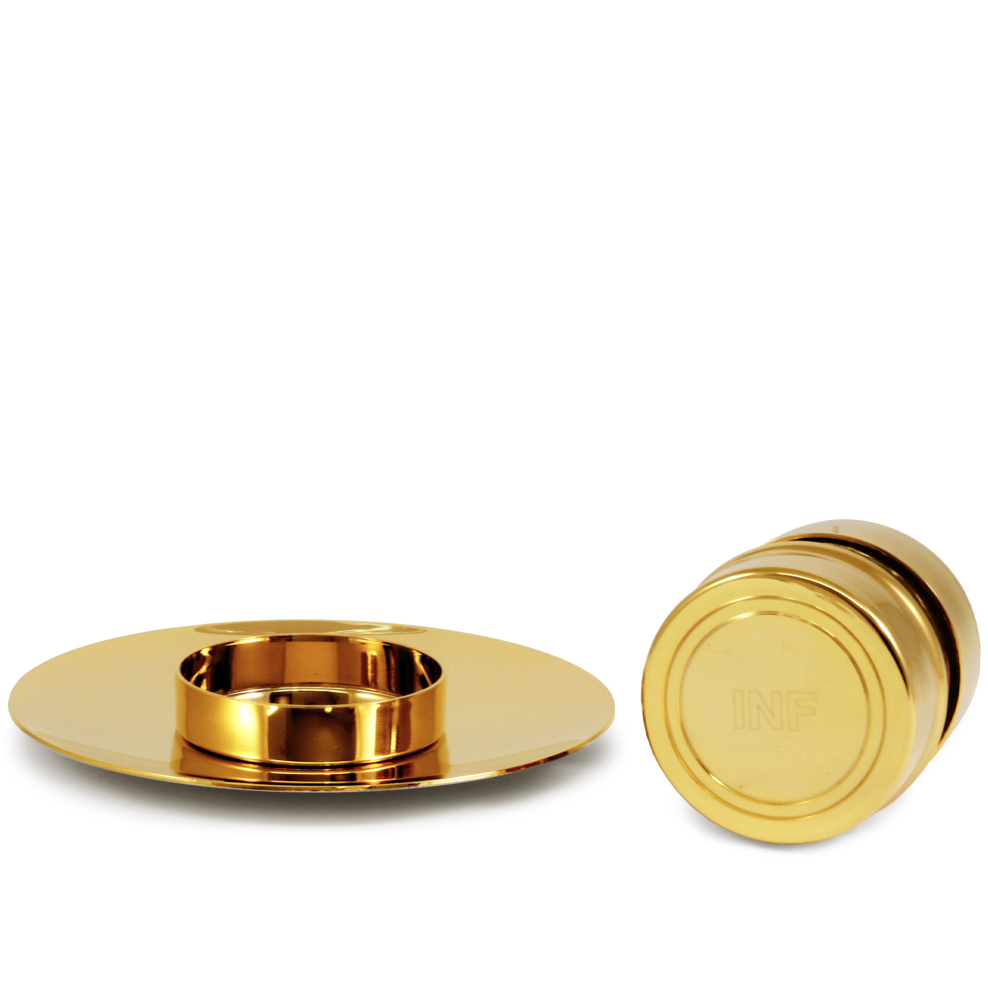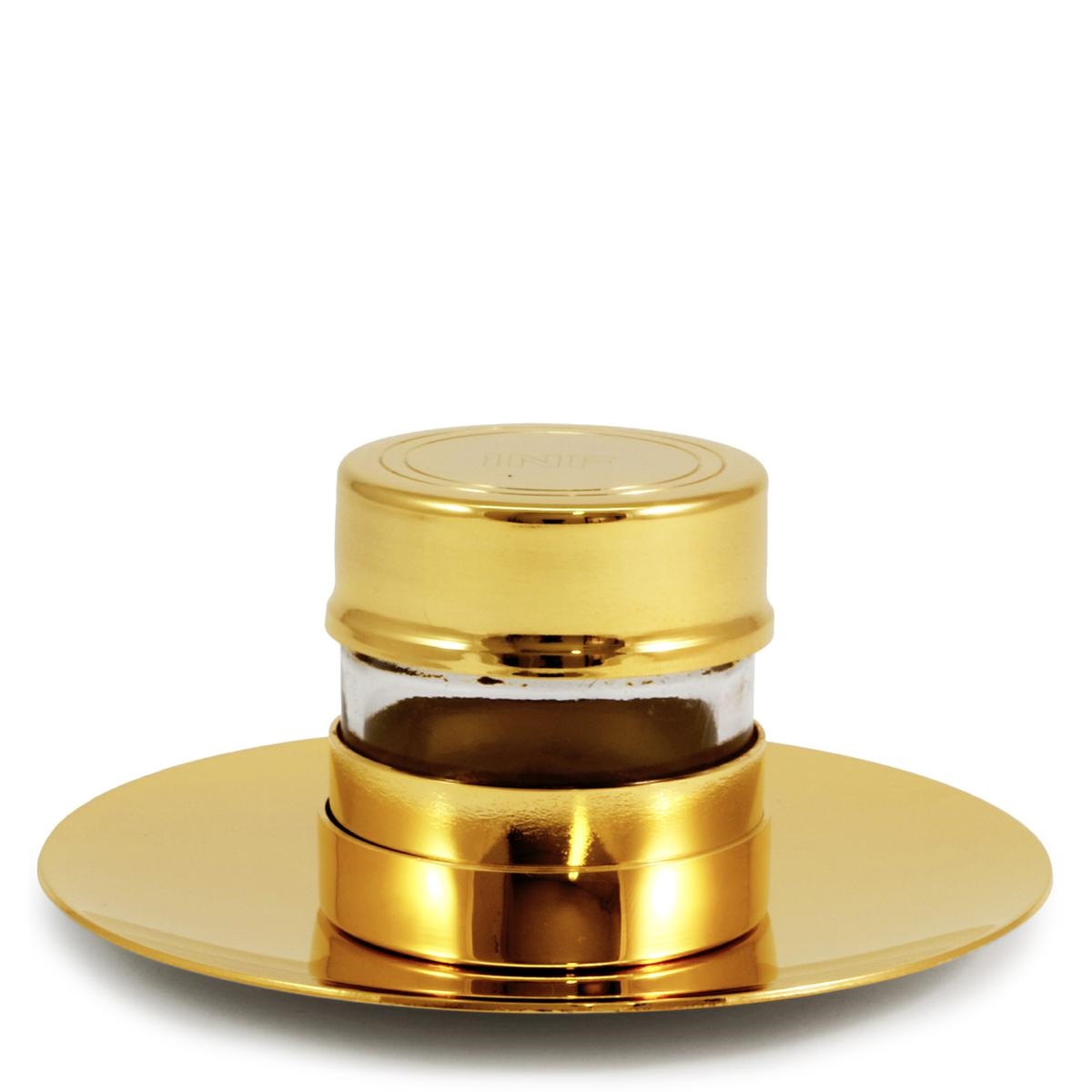 Gold-plated brass saucer with jar stand, complete with glass Holy Oils stock with protective gold-plated brass armor with INF engraved lid.