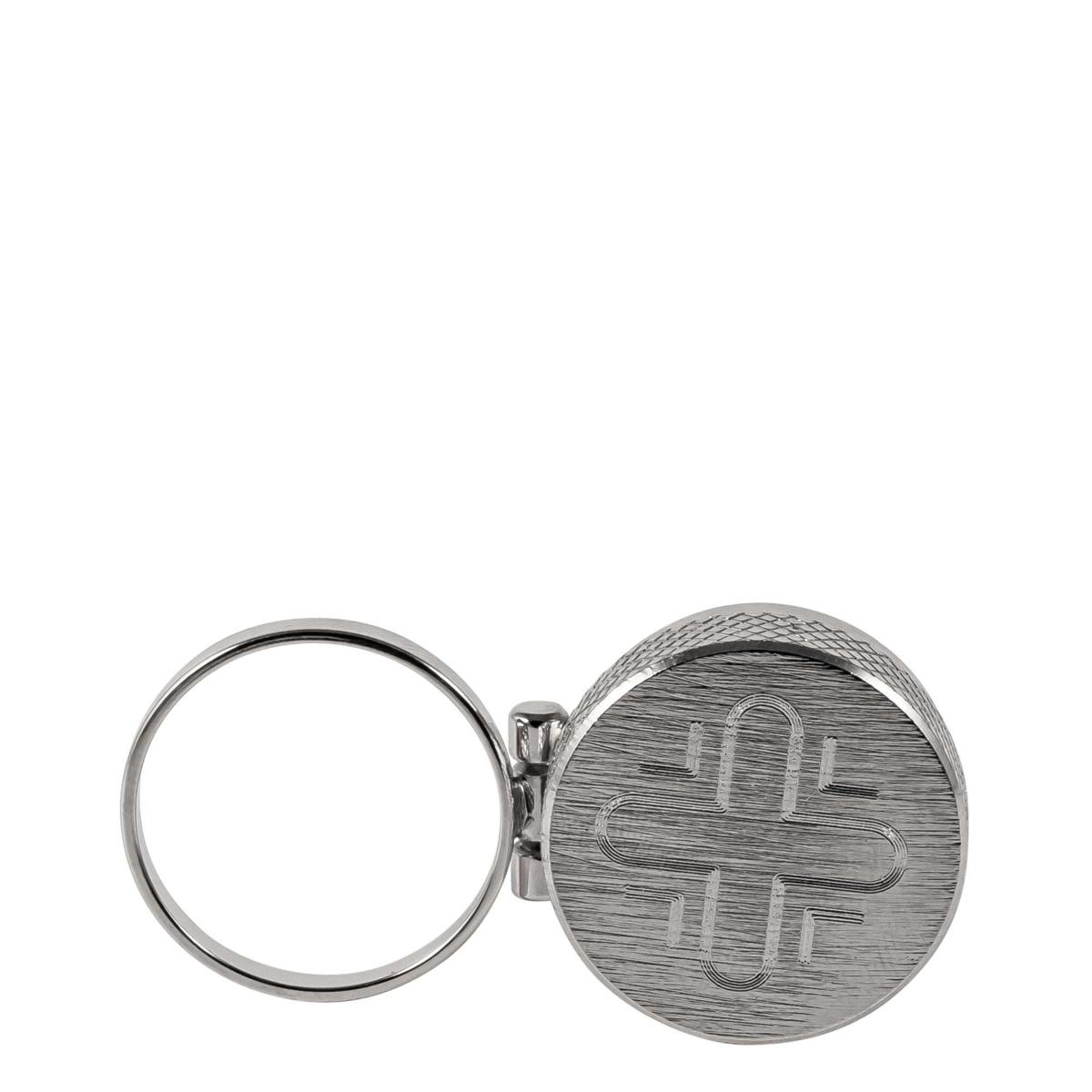 Vasetto per Oli Santi in ottone tono argento, con anello e croce incisa sul coperchio.