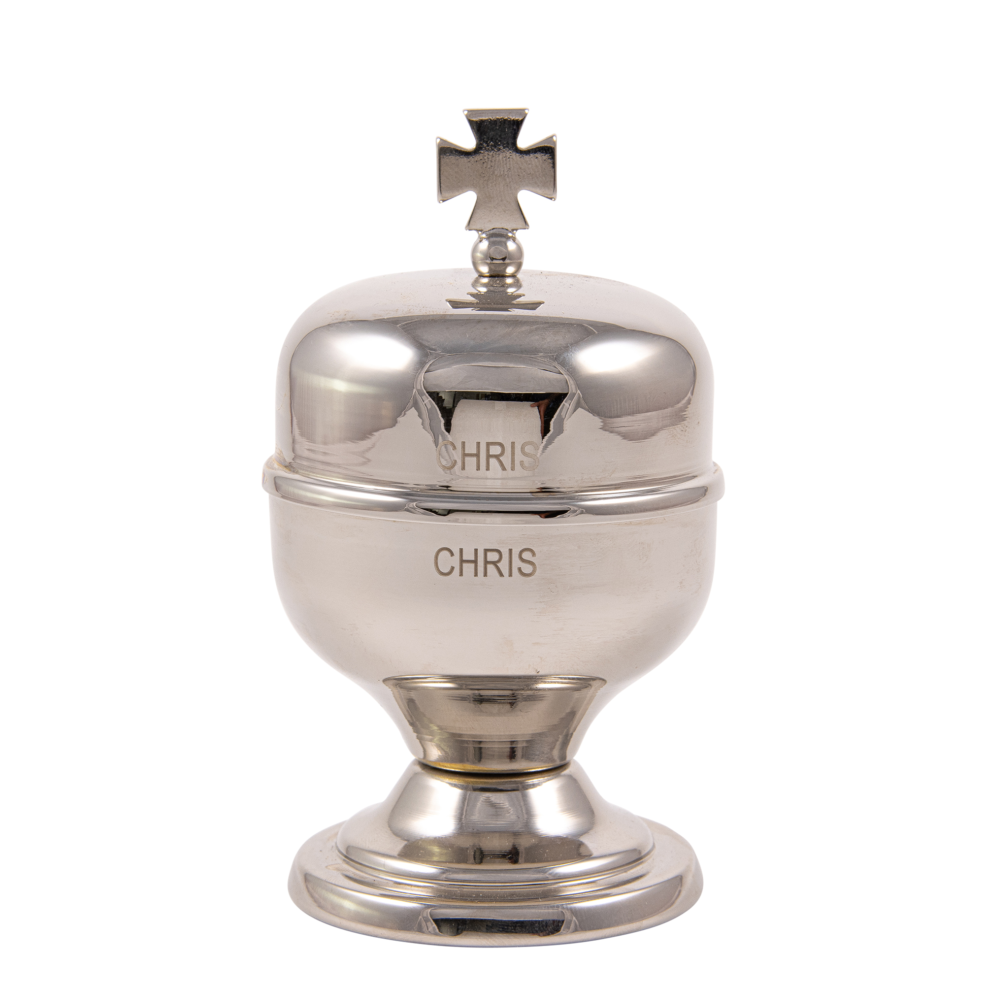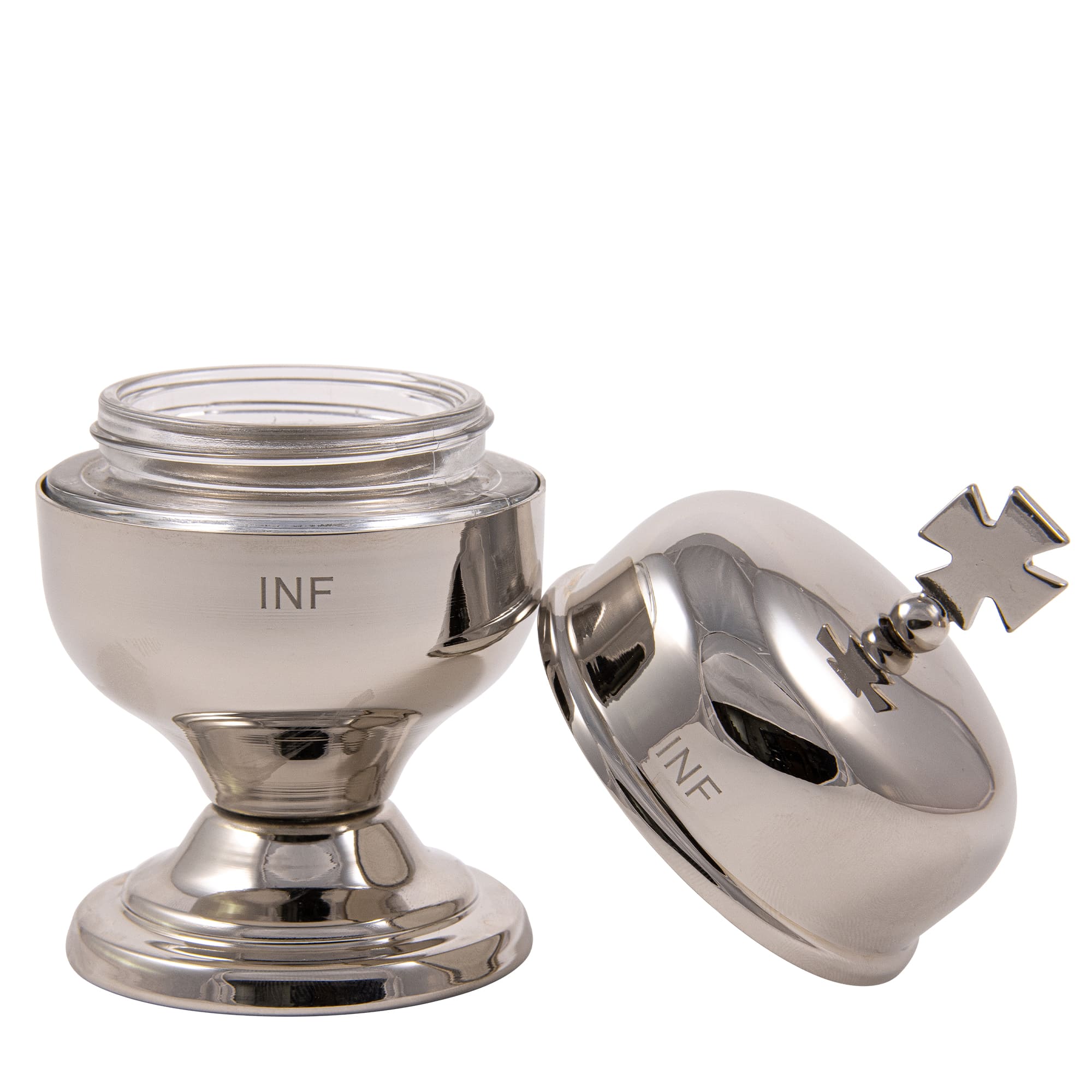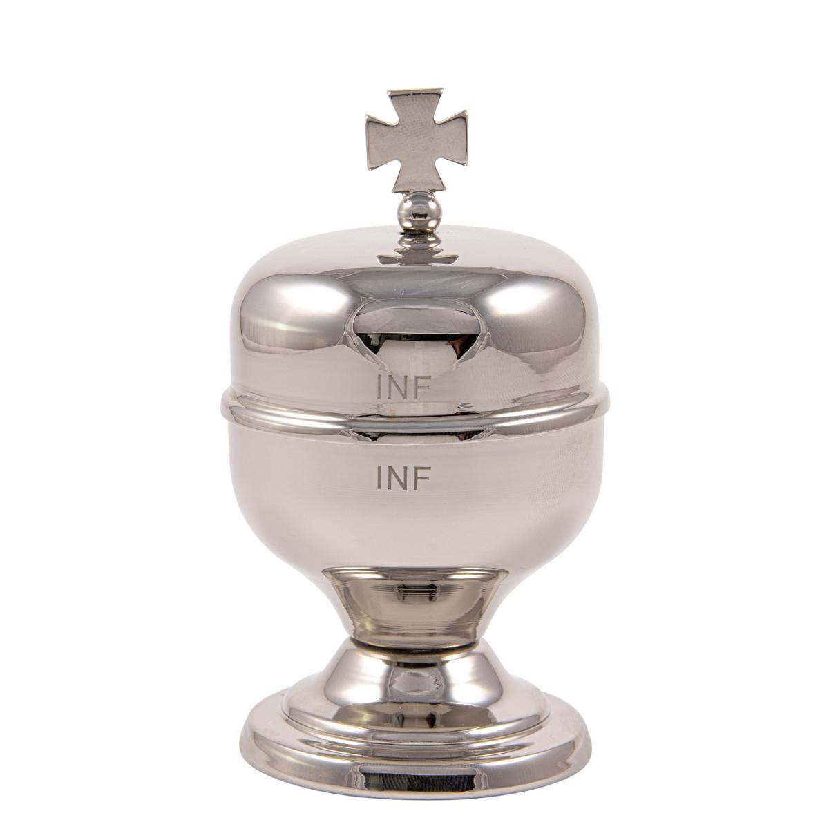 Vasetto per oli santi in ottone tono argento con interno in vetro, modello Crismera. La capienza del vasetto è di 50 cc.