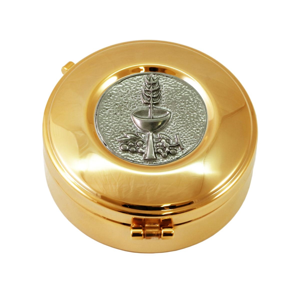 Host box in gold plated brass with a decorative plaque in relief, depicting a basket with grapes and the IHS symbol.