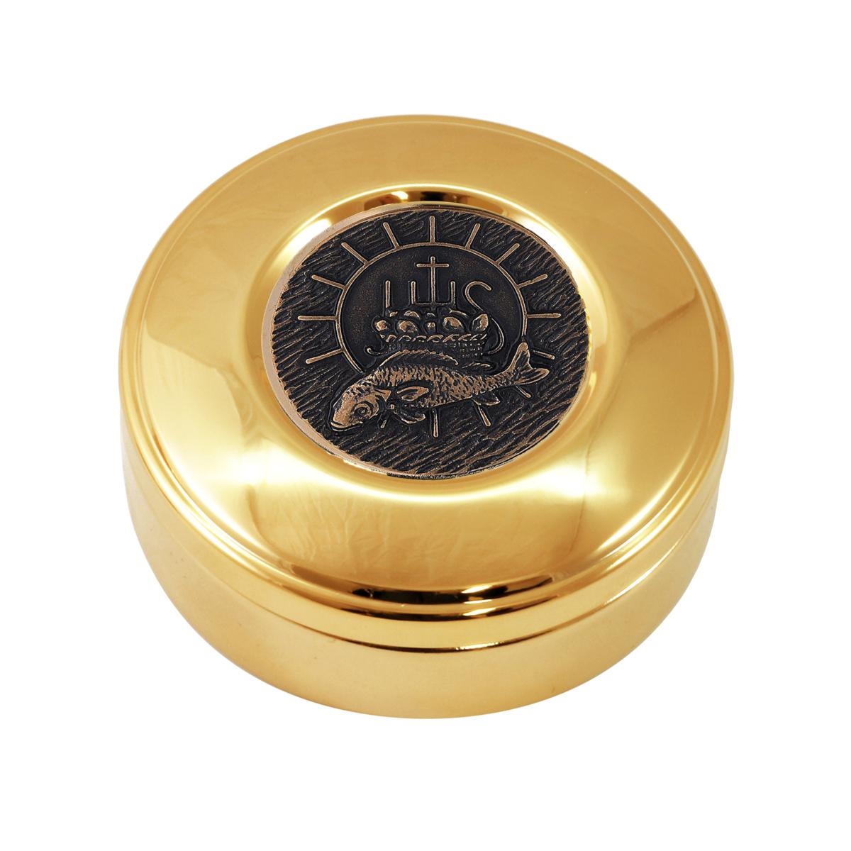 Scatola porta ostie in ottone dorato con placca decorativa in finitura bronzo antico, raffigurante un pesce con un cesto di pane e il simbolo IHS nello sfondo.