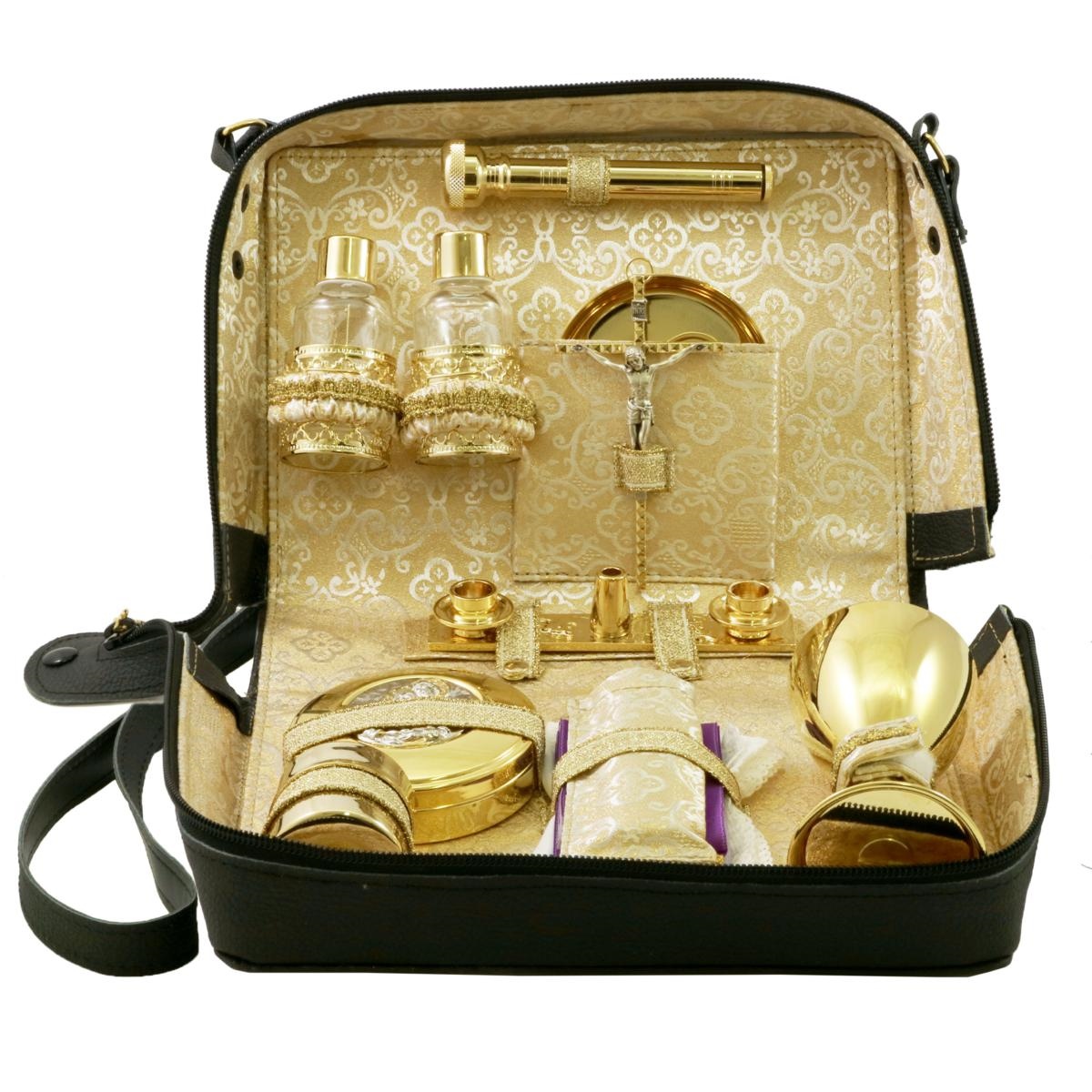 Borsello in Vera Pelle con tracolla, internamente foderato in Raso damascato dorato e completo di tutto il necessario per la celebrazione all' aperto.