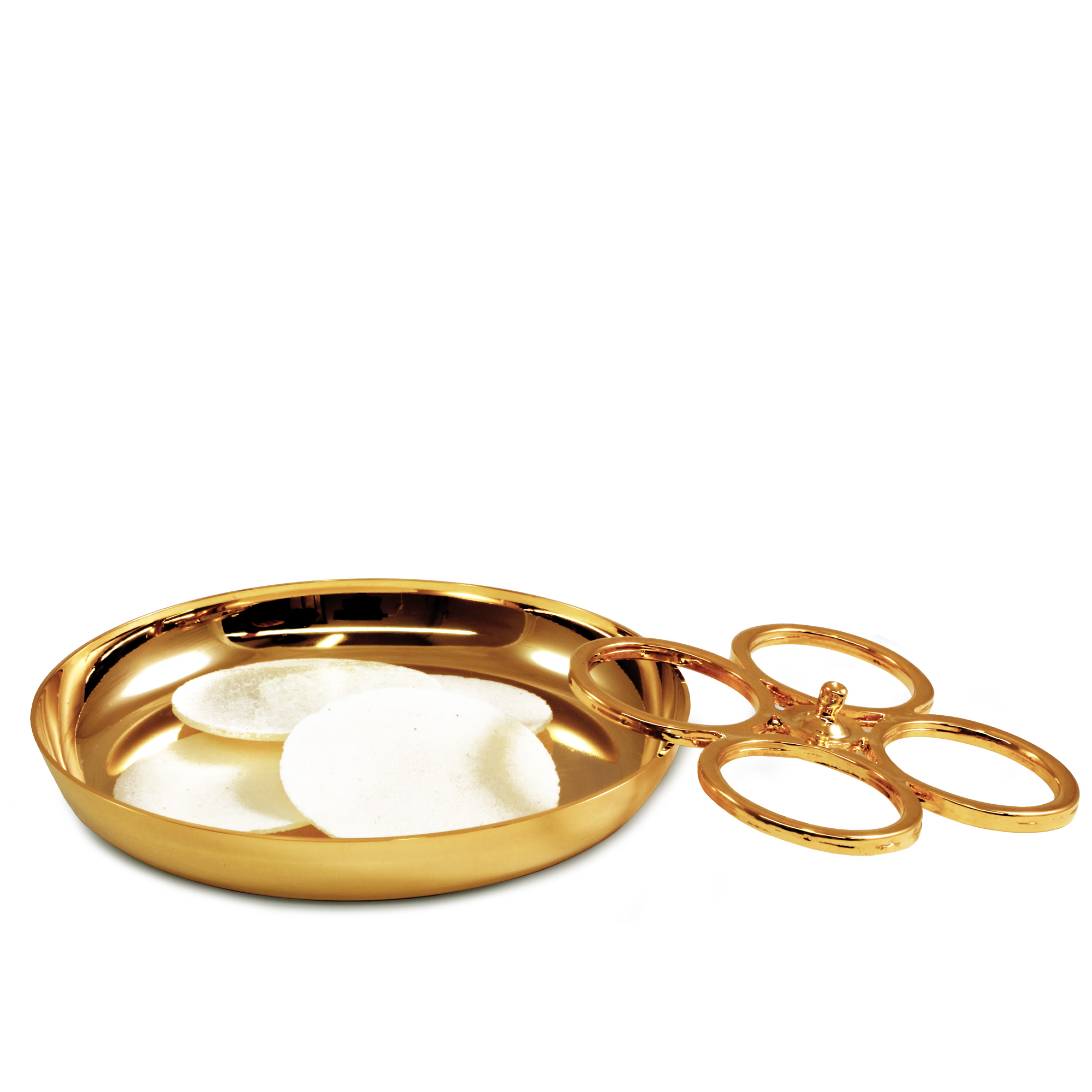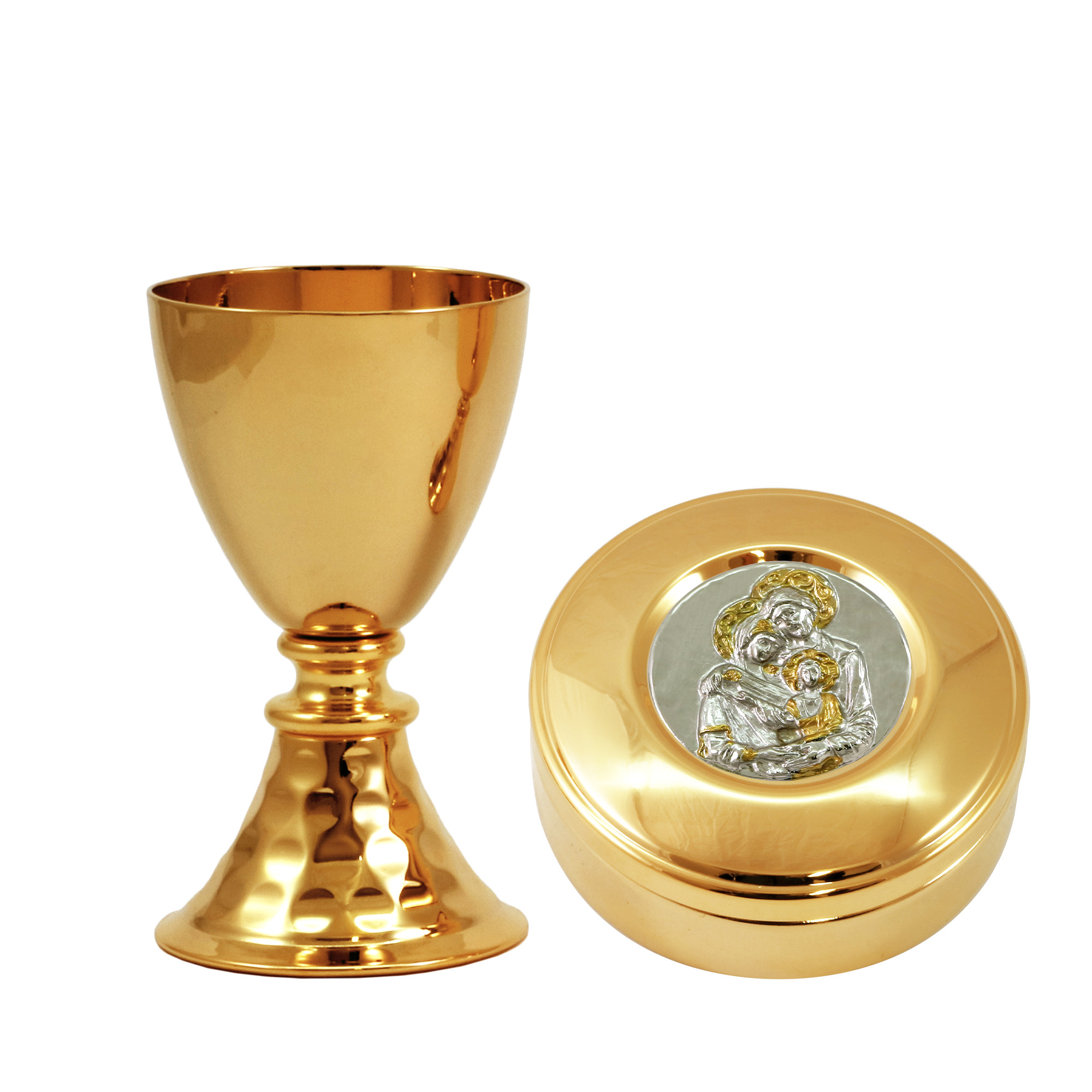 -Teca porta ostie in ottone dorato con placca decorativa. La teca ha un diametro di 8 cm. e contiene circa 40 particole.