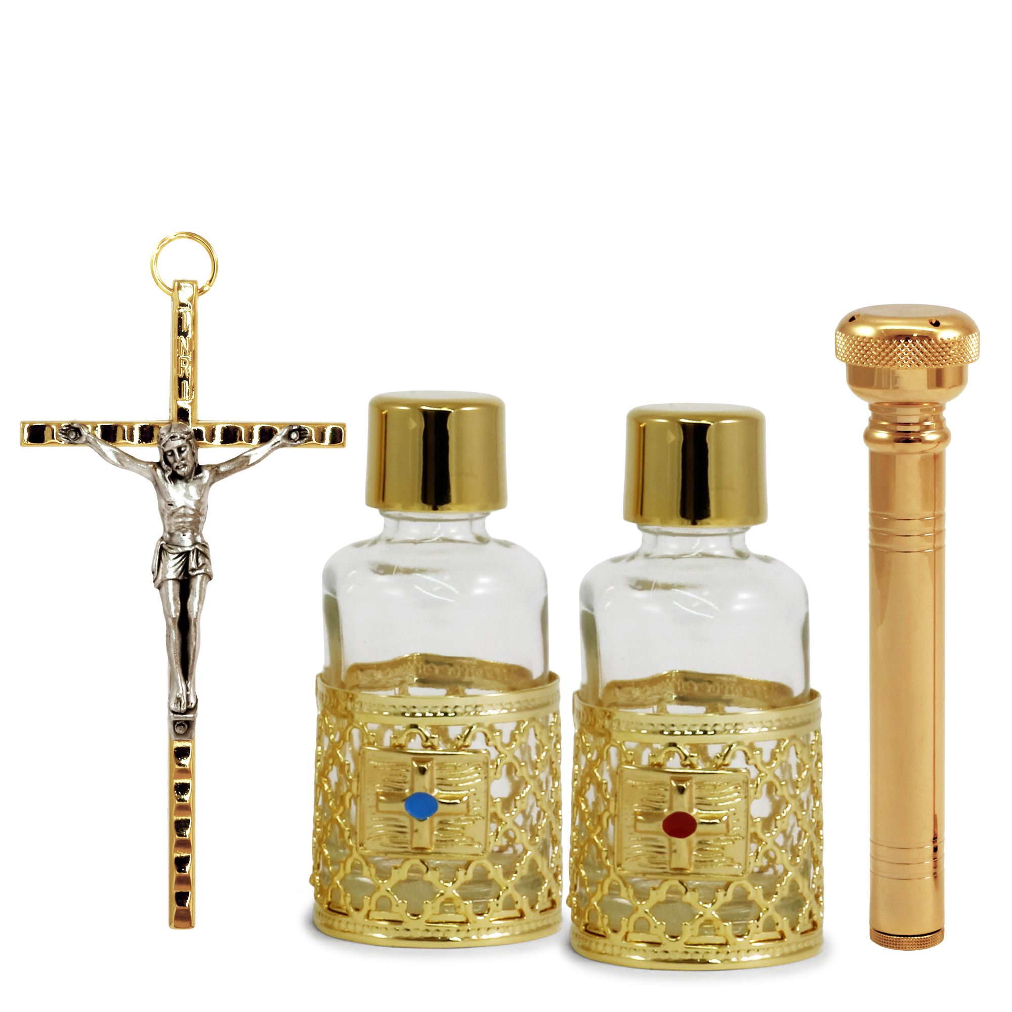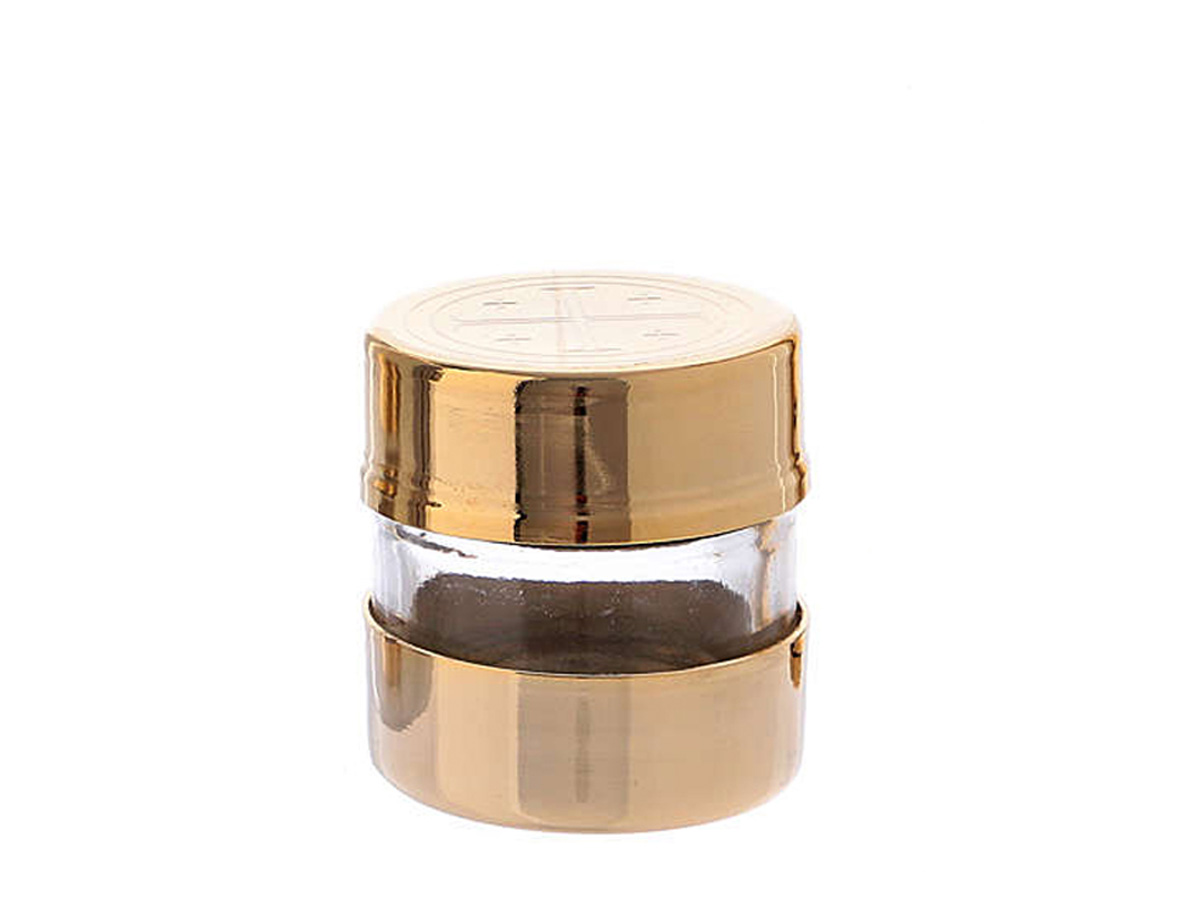 -Vasetto in vetro per Oli Santi con corazza protettiva in ottone dorato con Croce di Jerusalem incisa sul coperchio.