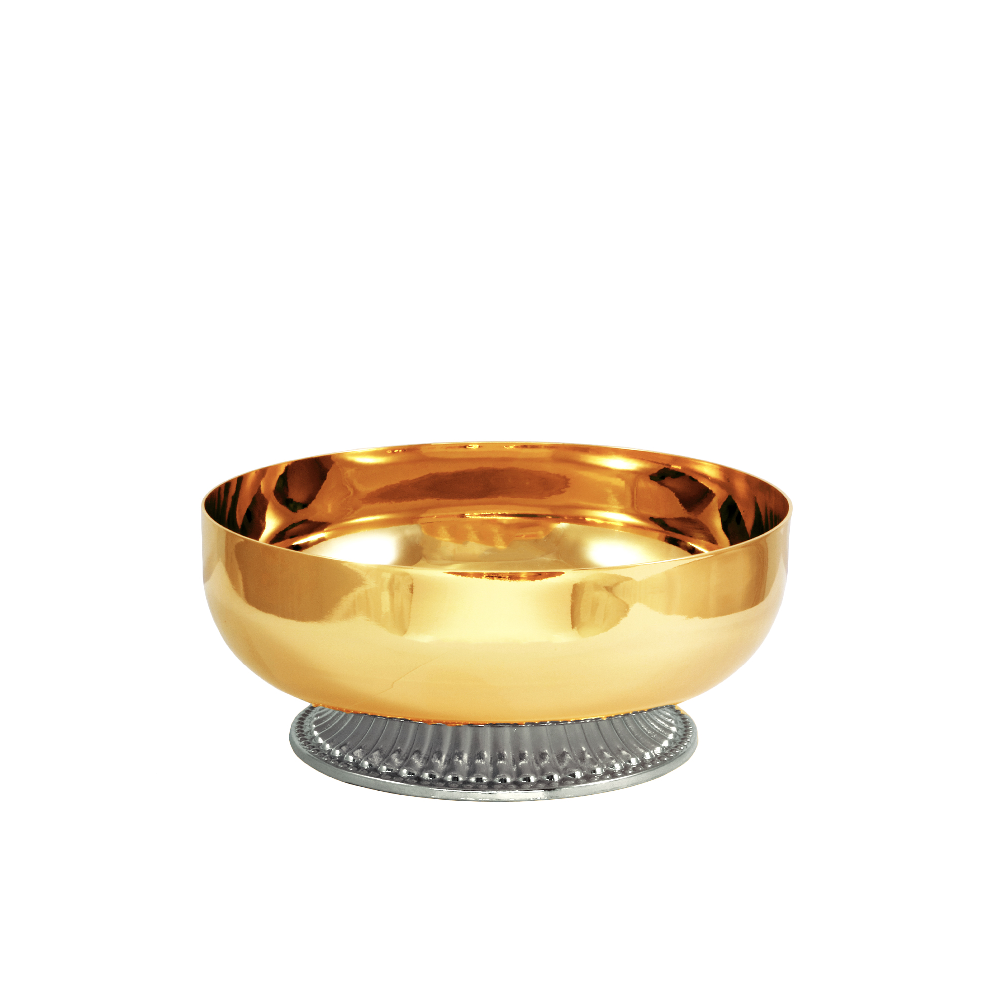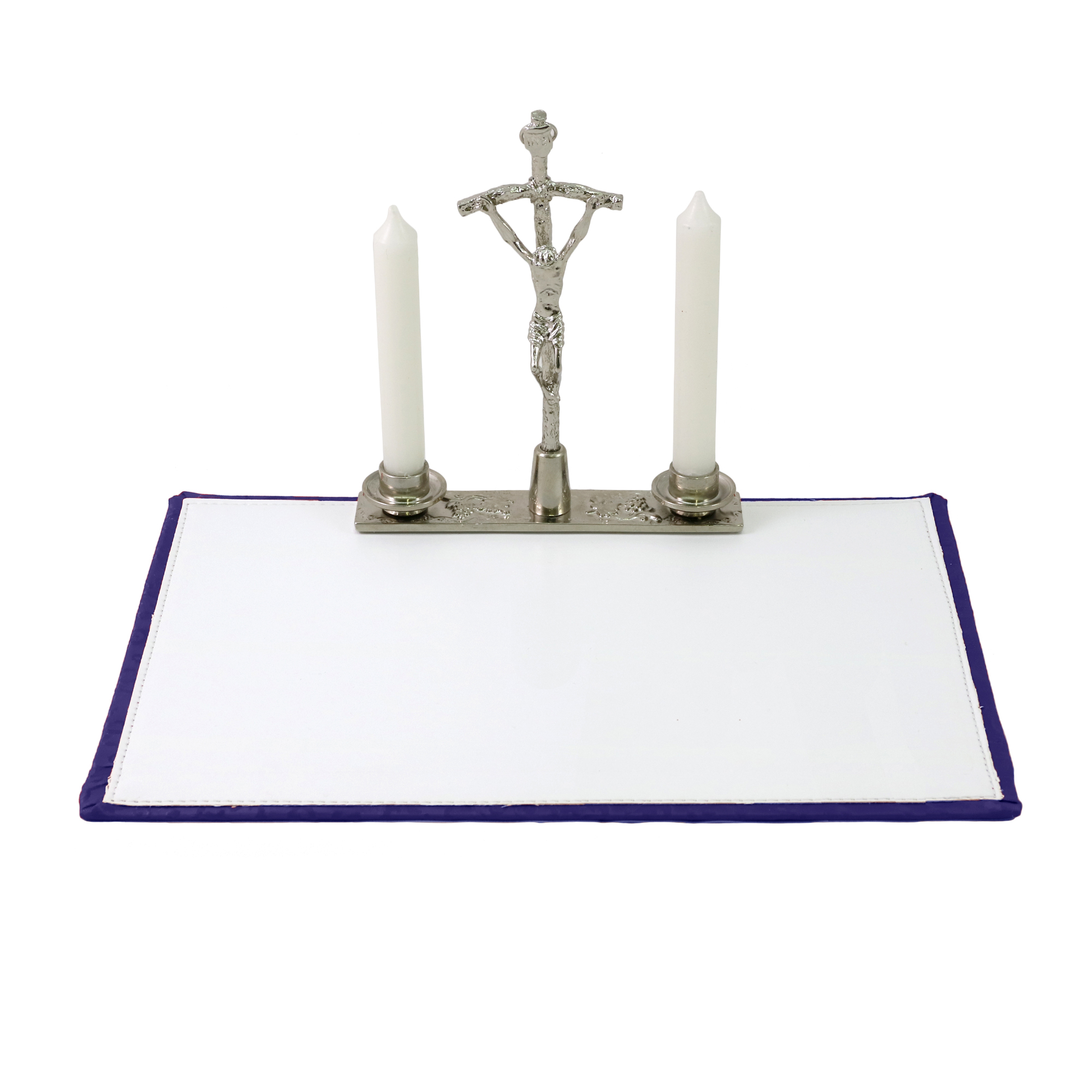 The item is complete with: - Chalice and Ciborium in gold plated brass with hammered base and baroque knot. The chalice is 13 cm high with a 6.5 cm diameter cup and can hold up to 120 ml of wine. The Ciborium is 13 cm high with an 8 cm diameter cup and contains approximately 60 hosts. - Bowl in gold plated brass with a diameter of 10 cm. - Asperges in silver-tone brass 11.5 cm with hermetic seal. - Saucer in gold plated brass with a diameter of 10 cm. -Host box in gold plated brass with a decorative hand-enamelled plaque. The Host has a diameter of 8 cm and contains approximately 40 hosts. - Glass Holy Oils stock with protective silver-tone brass armor with Jerusalem Cross engraved on the lid. - Cast altar with embossed grape and vine leaf decoration and equipped with a support for the cross and candles. - 125 ml bottles for water and wine with distinctive hand-enamelled plaque. - Pastoral cross and wax candles with candle holders in coordinating fabric. - Protective cushion in coordinating fabric with gold-thread PX embroidery. - Two-tone purple and white fabric stole, 150 cm. - Set of 5pcs 100% cotton linens with gold-thread embroidered cross.