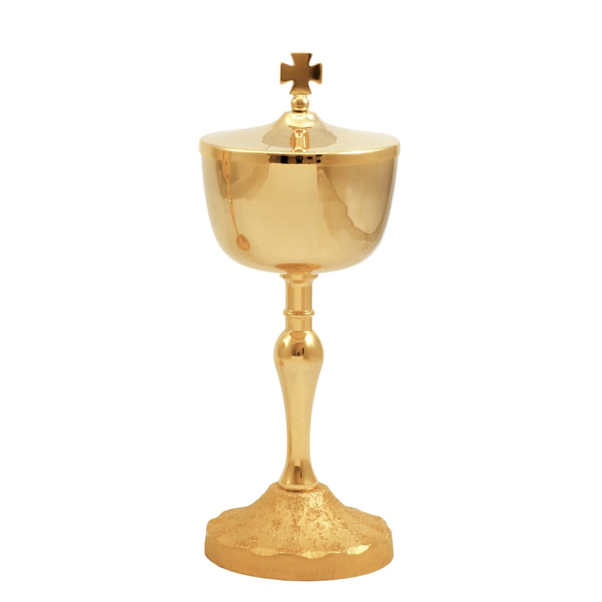 Travel chalice and ciborium in gold plated brass with a medieval-style base and knot. The chalice is 18 cm tall and has an 8 cm diameter cup that can hold up to 120 ml of wine. The ciborium is 118 cm tall and has an 8 cm diameter cup that can hold up to 80 hosts.