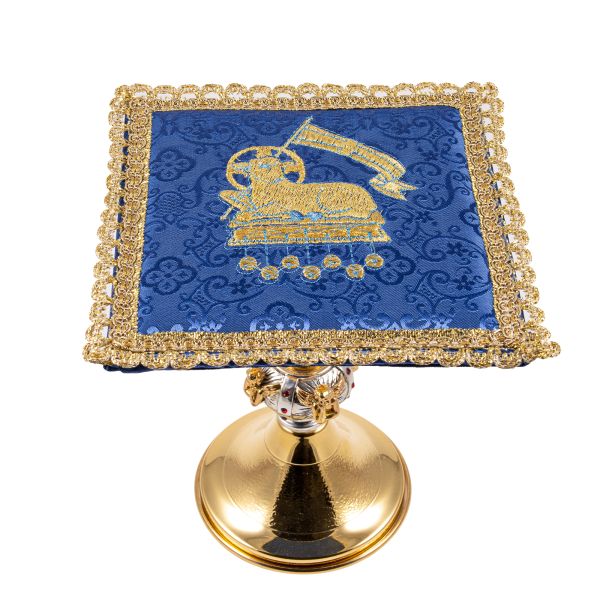 Rigid chalice pall covered in elegant blue satin, with embroidery depicting the Lamb of God lying on the book of the seven seals.