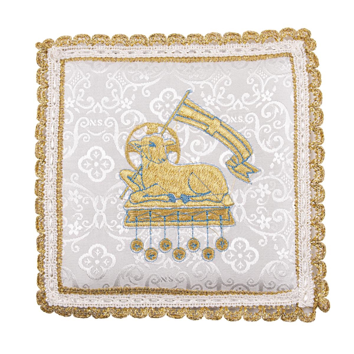 Palla rigida per calice rivestita elegante Raso bianco, con ricamo raffigurante l'Agnello di Dio che giace sul libro dei sette sigilli .