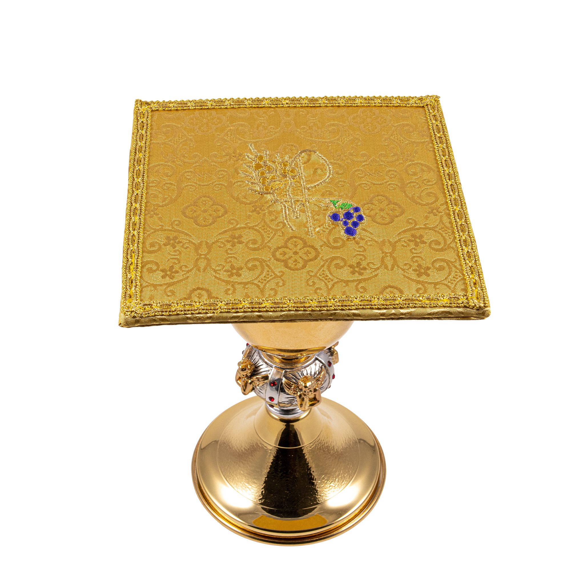 Rigid chalice pall covered in yellow satin, with gold thread embroidery depicting the PX symbol with grapes and an ear of wheat.