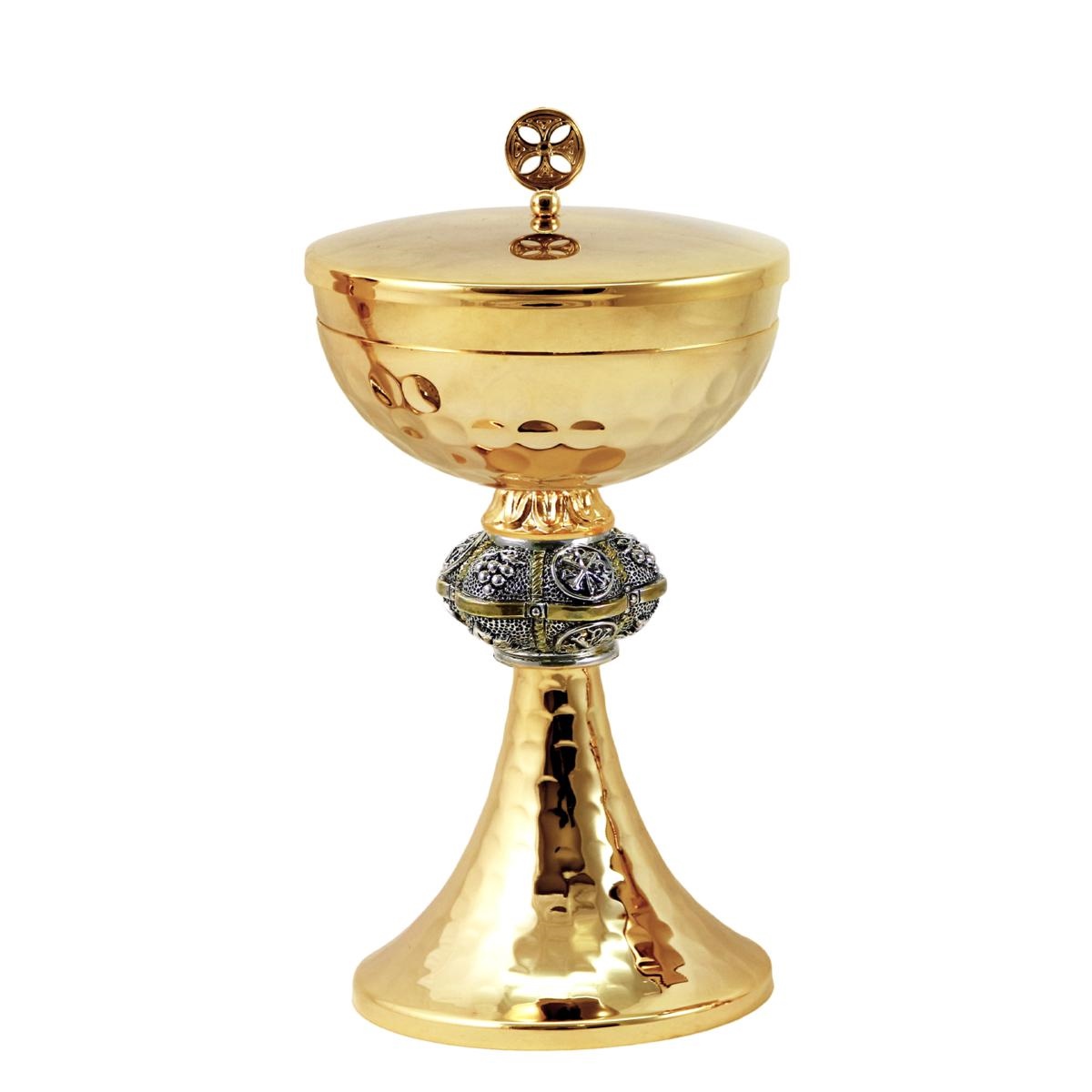 Chalice and Ciborium in gold plated brass with a hammered base and saucer and an elegant "Grape and PX" knot in an antique silver and gold finish. The Chalice is 21.5 cm tall and has a 10 cm diameter cup that can hold up to 350 ml of wine. The Ciborium is 20 cm tall and has a 12 cm diameter cup that can hold up to 150 particles.