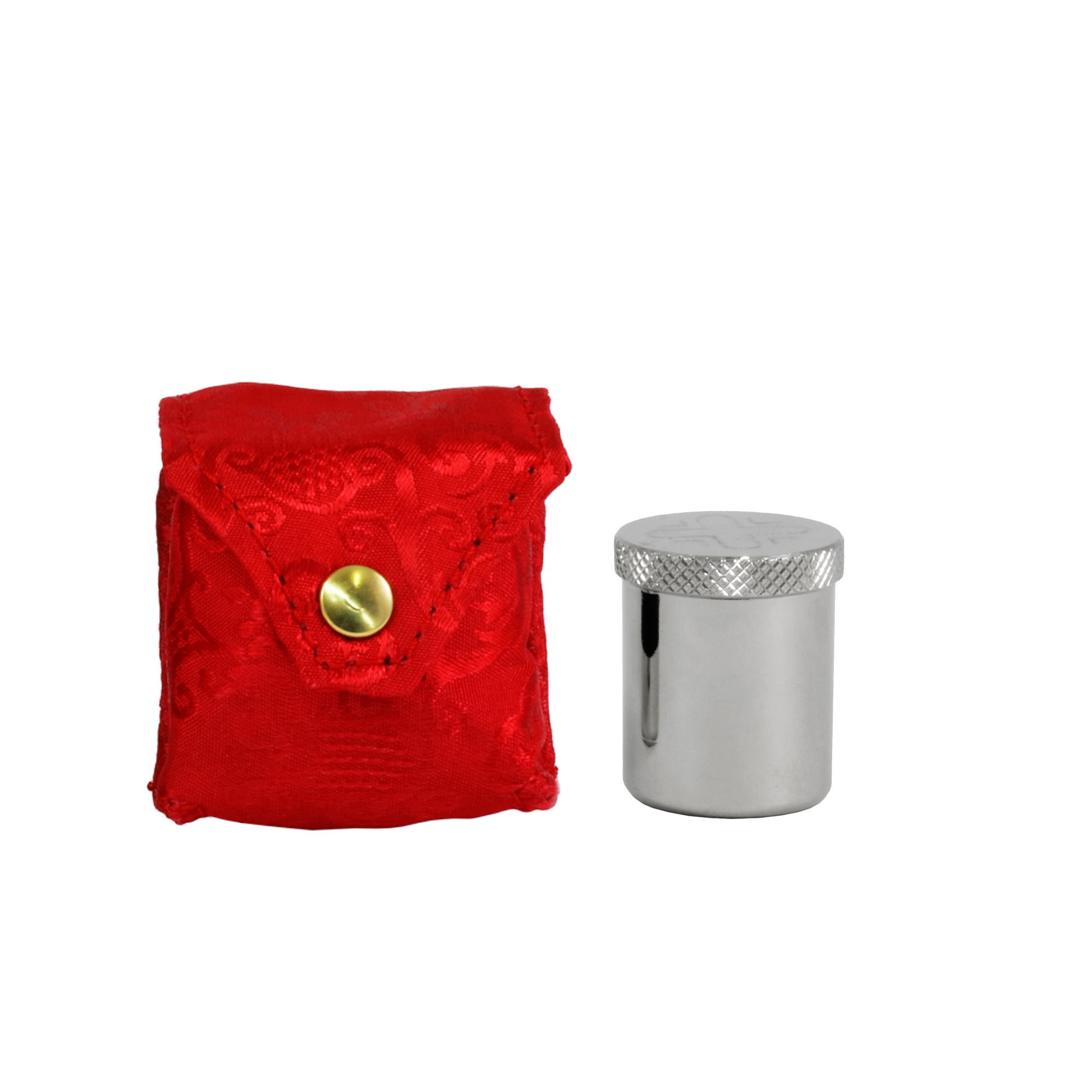 Holy oils stock is made of silver-tone brass and a cross is engraved on the lid.