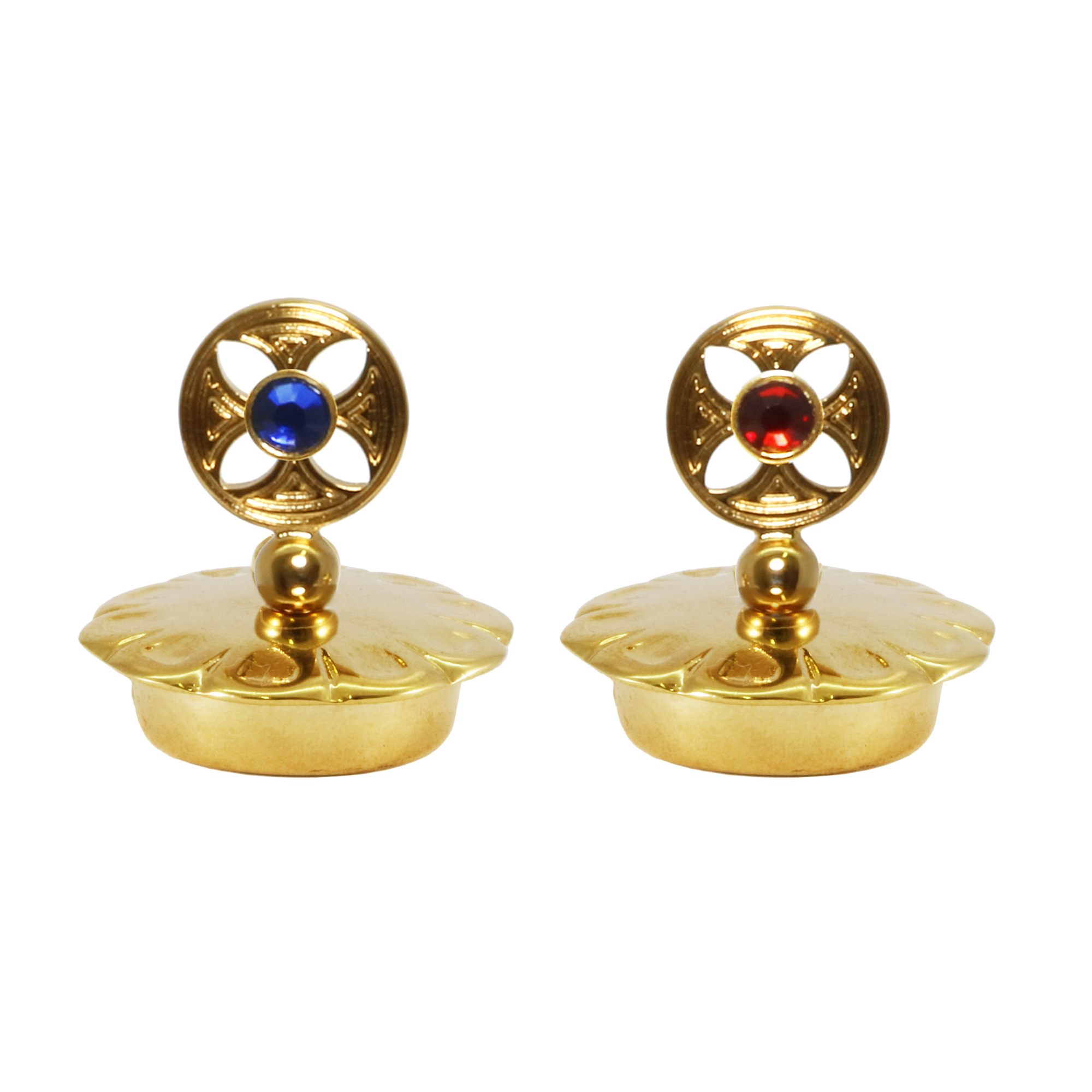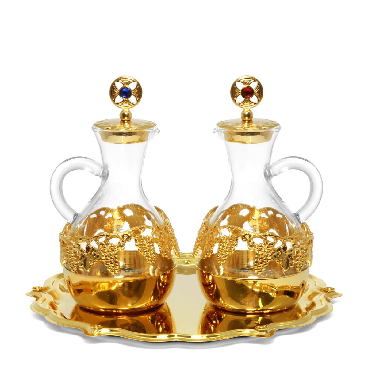 Water and wine set in gold plated brass with a distinctive, soft-lined plate. Plate featuring two practical bases that hold the jugs and keep them stable when moving. "Palermo" glass jugs with grape and vine leaf decoration. Caps with a round cross and inlaid red and blue stones to distinguish water from wine.