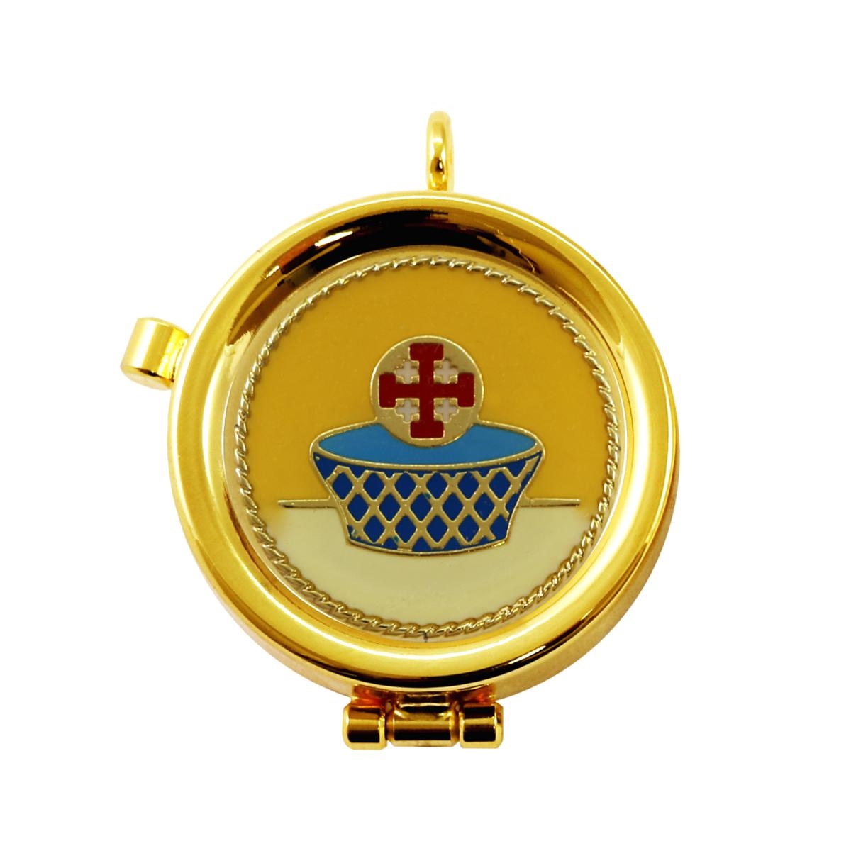 Mini Eucharistic pyx with a hand-enamelled decorative plaque depicting a bread basket with a cross on it, on a yellow and white background. It features a ring for carrying it around the neck and a practical latch for easy opening. The pyx has a diameter of 4 cm and a height of 2 cm. It holds approximately 4 hosts.