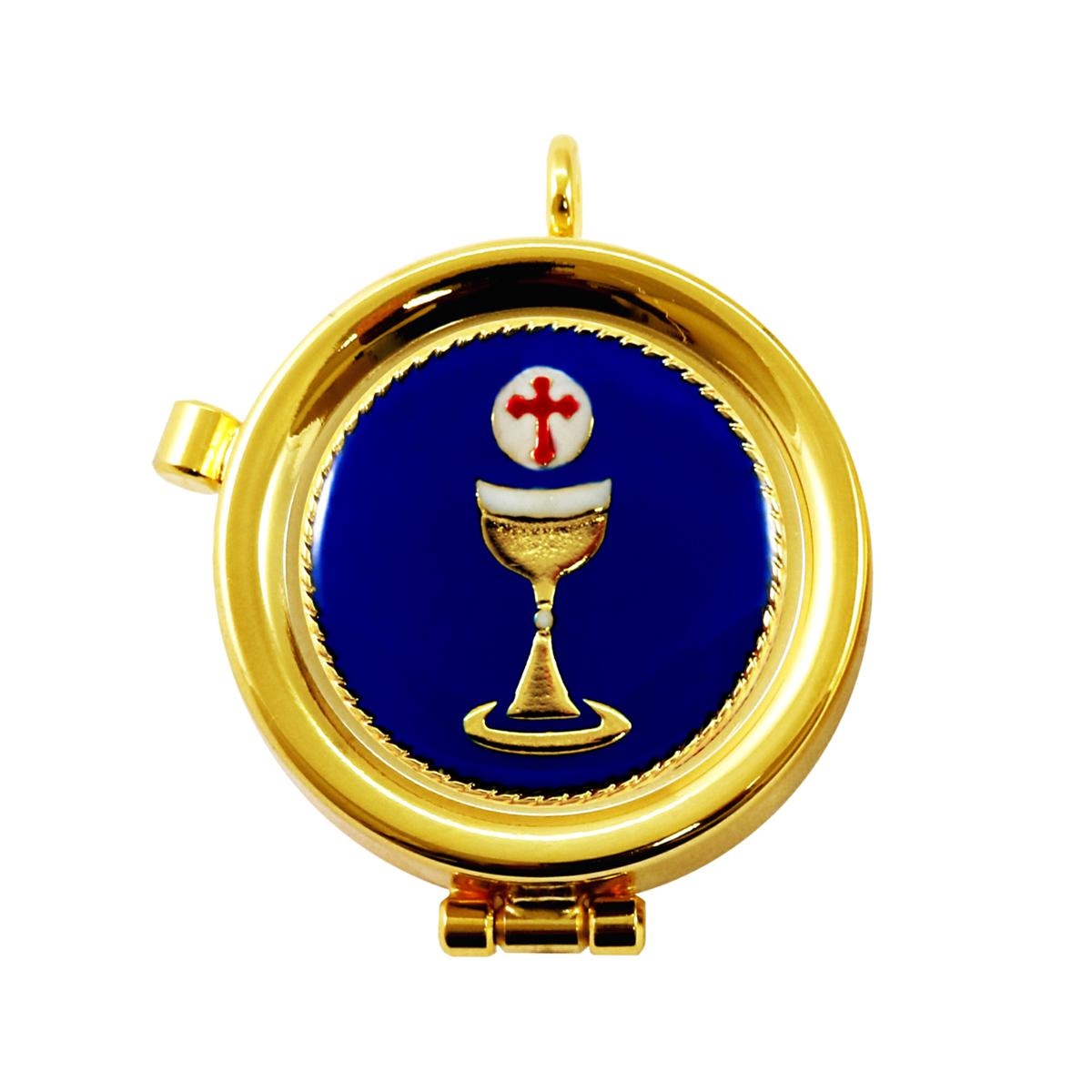 Teca Eucaristica Mini con placca decorativa smaltata a mano, raffigurante l'immagine di un calice con sopra una Croce, su sfondo blu.