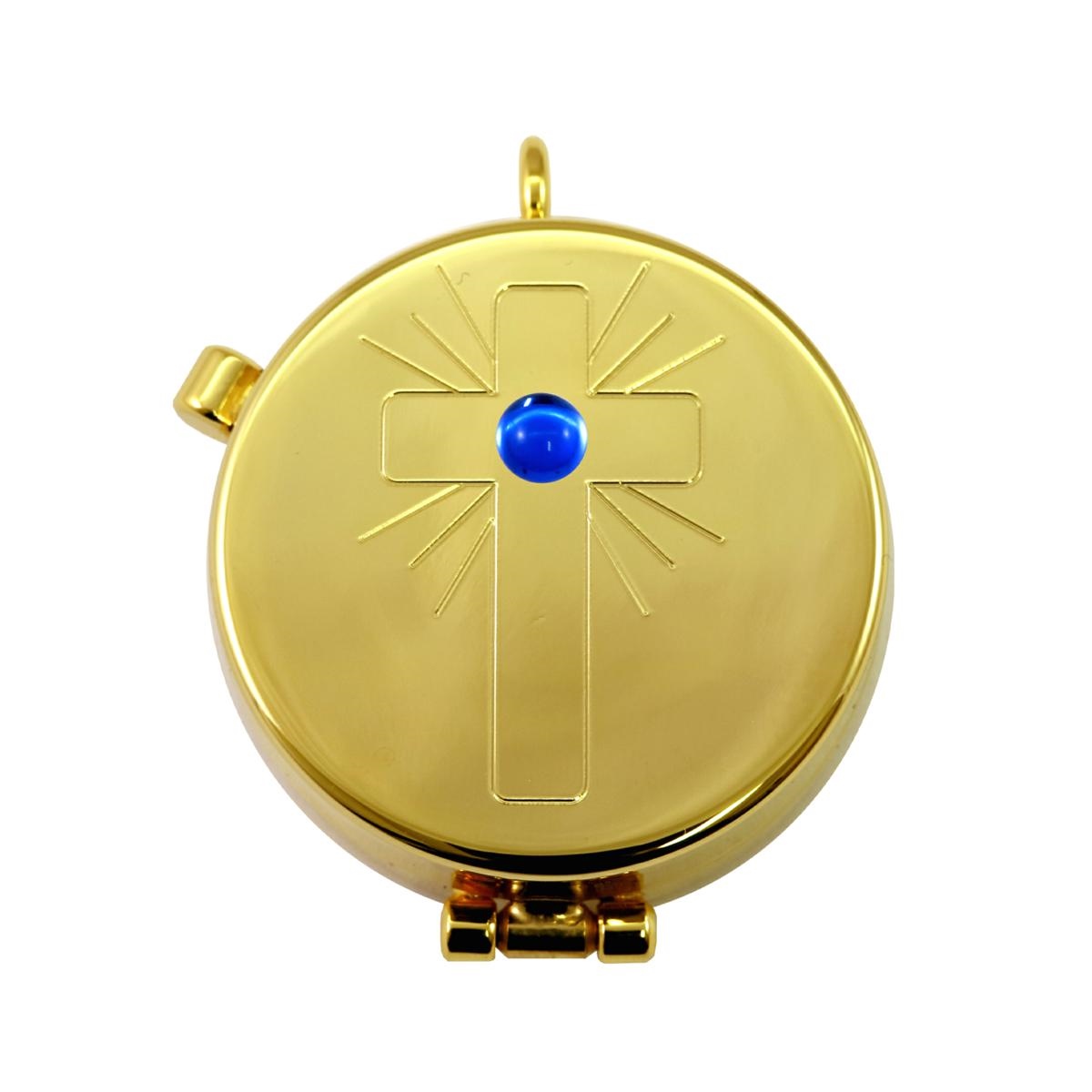 Teca Eucaristica Mini con Croce incisa e pietrina blu al centro. E' dotata di anello per portarla al collo e di pratico scrocchetto per una facile apertura.