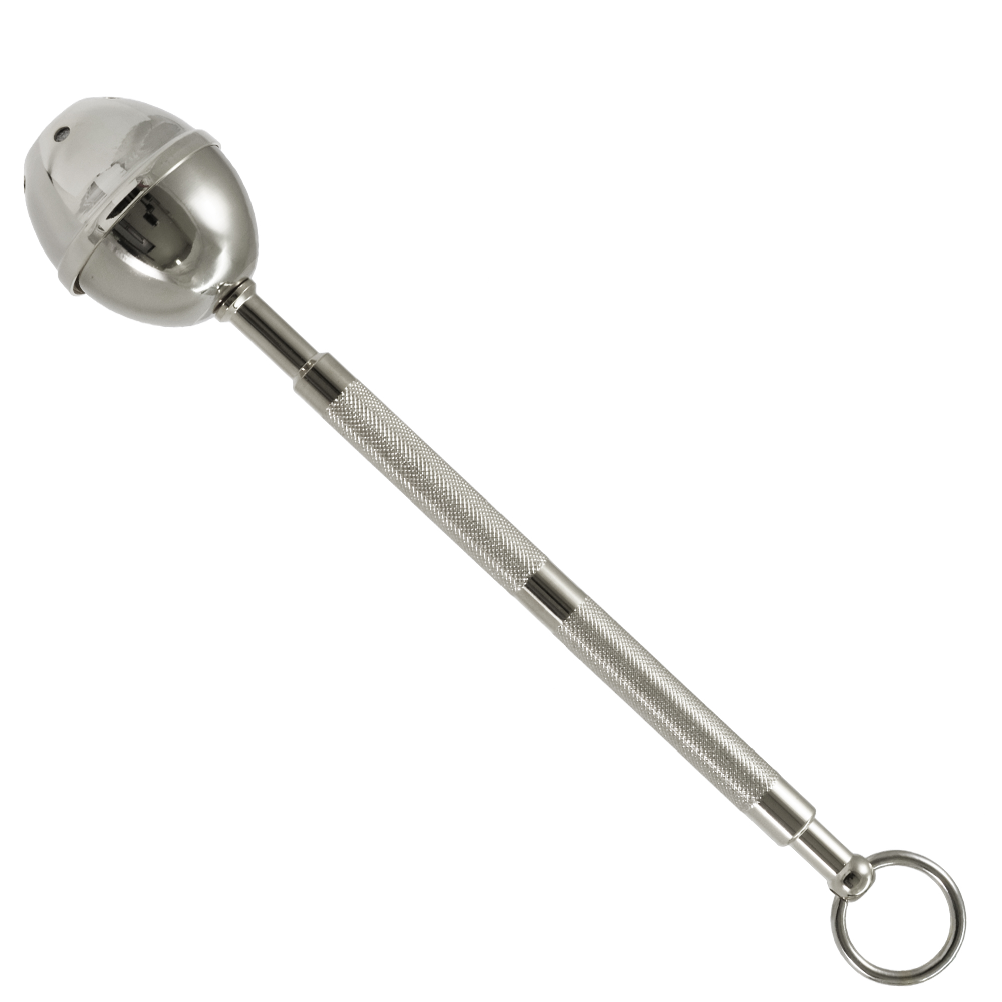 Silver-tone brass blessing sprinkler with a cross in the center. Thanks to its practical ring on the handle, it can be hung on a thurible case